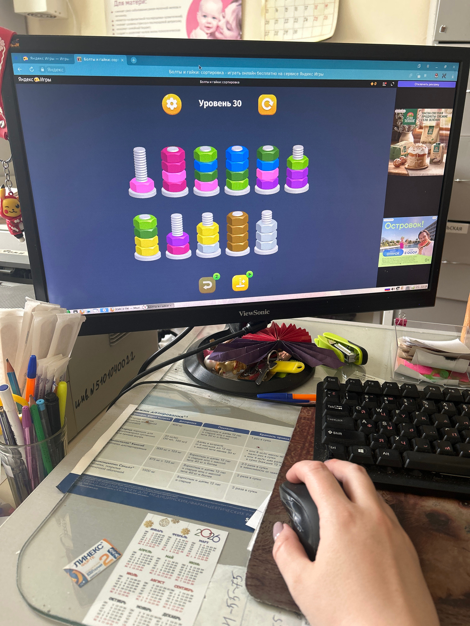 The image captures a cluttered workspace with a focus on a computer monitor displaying a puzzle game called "Bolts and Nuts: Sorting" on the Yandex Games platform. The screen also shows advertisements…read more