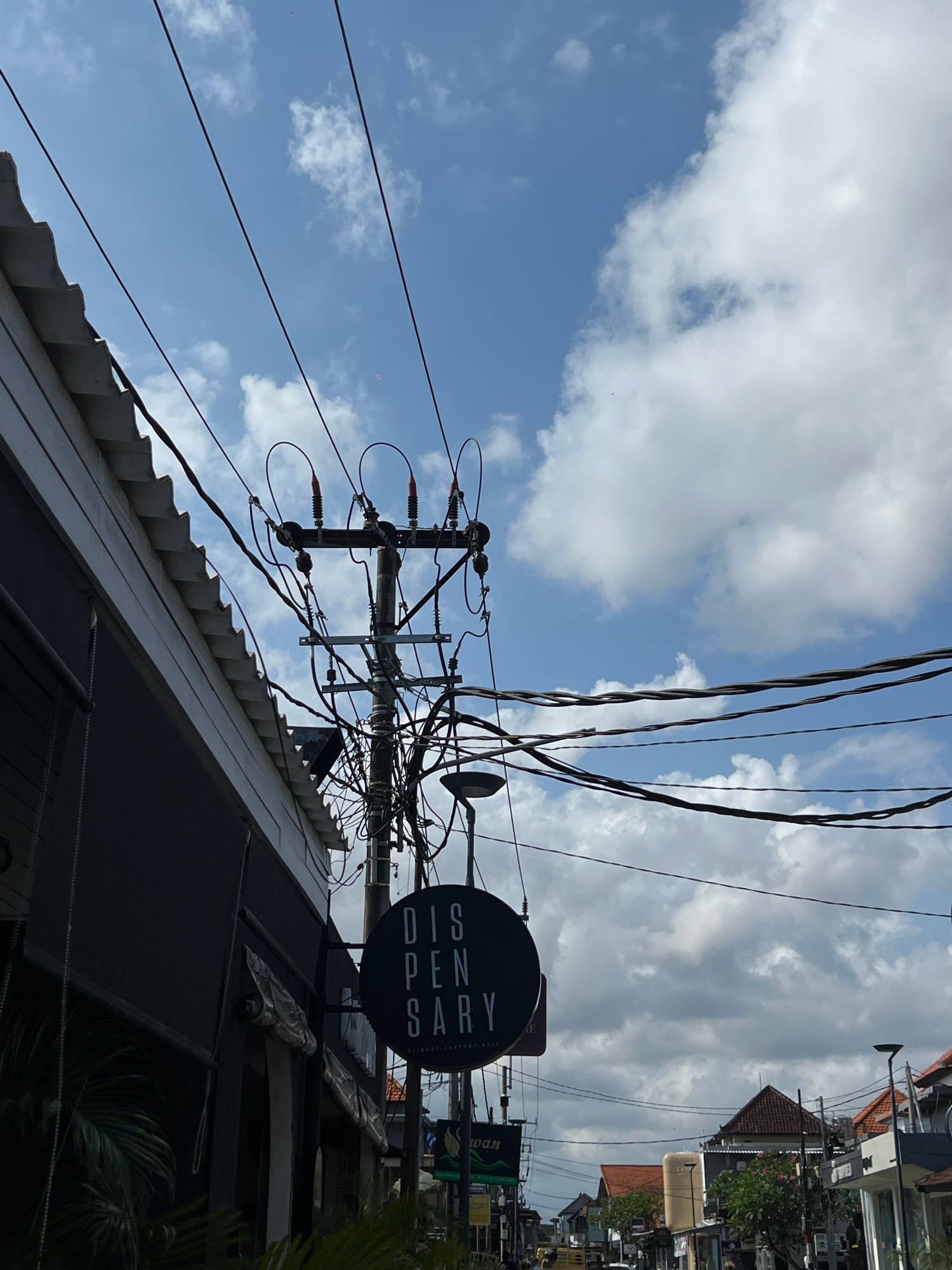 A streetscape in North Kuta, Indonesia is captured from a low-angle perspective. The scene is dominated by a utility pole with numerous power lines stretching across a partly cloudy sky. A round black…read more