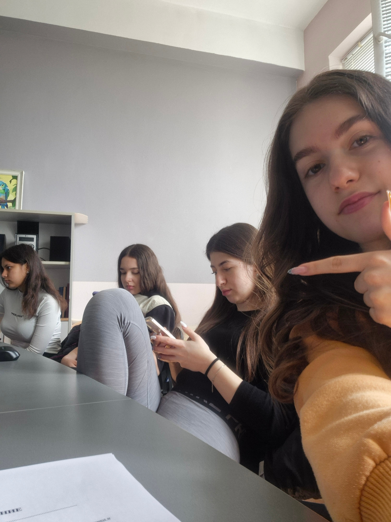 The image shows a group of four young women in an indoor setting. The woman closest to the camera is taking a selfie, her index finger extended. She is wearing a yellow sweater. Behind her, another wo…read more