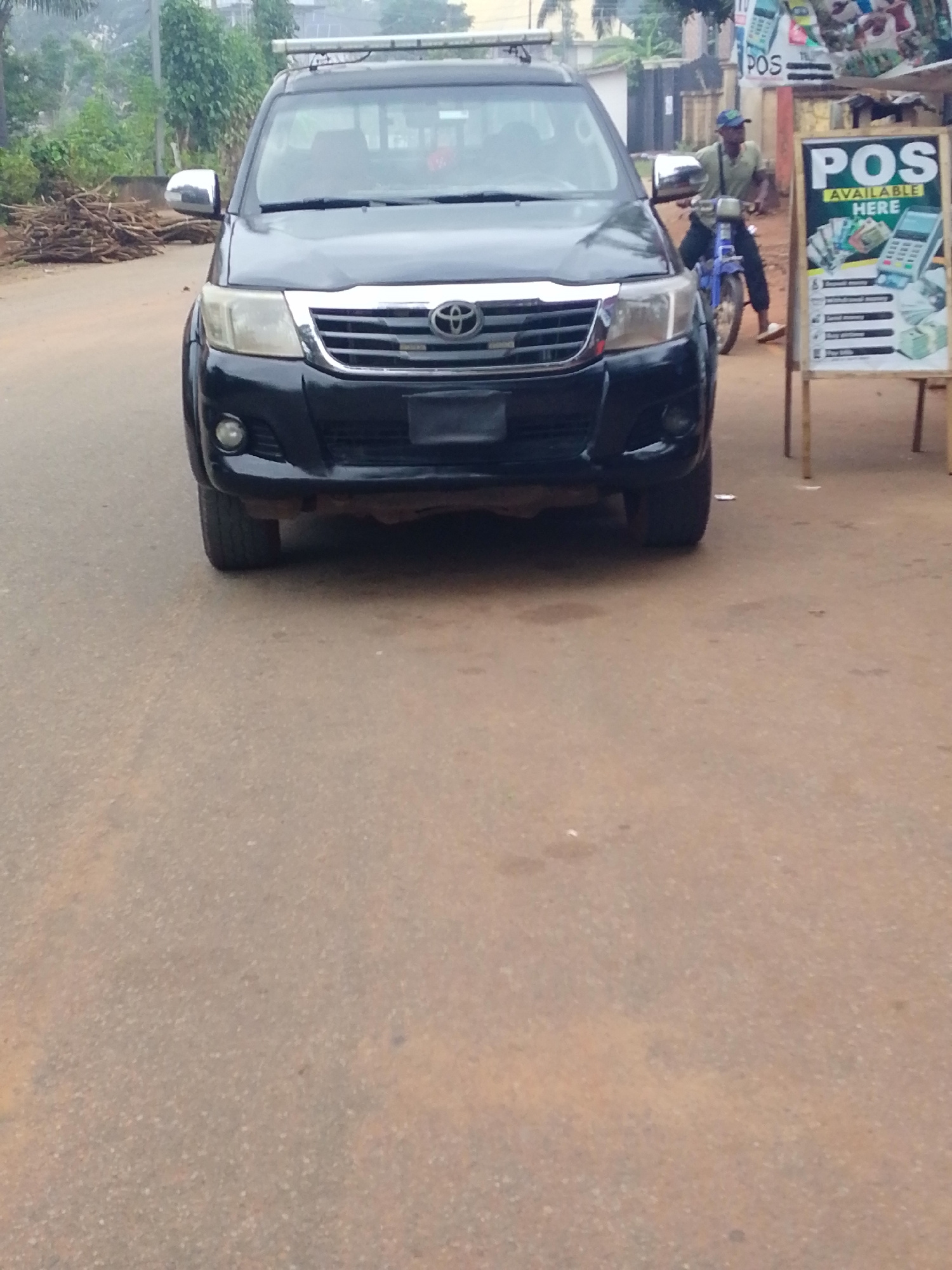 The scene is in Alor, Nigeria. A black Toyota Hilux truck is parked on the side of an asphalt road. To the right of the truck, a man wearing a blue cap and a light-colored shirt sits on a blue motorcyβ¦read more