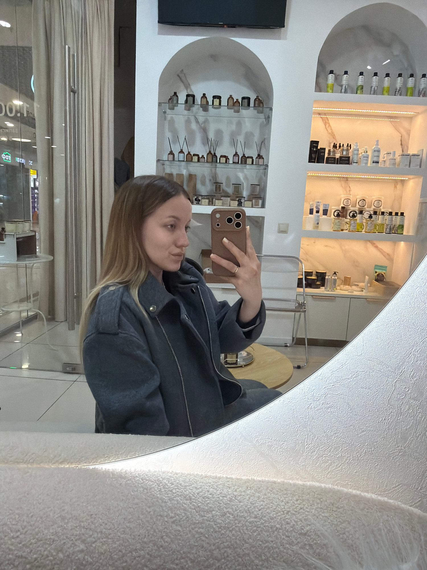 A person with blonde hair is taking a selfie in a mirror. The reflection in the mirror shows shelves stocked with cosmetic products, suggesting the location is a beauty salon. The background outside t…read more