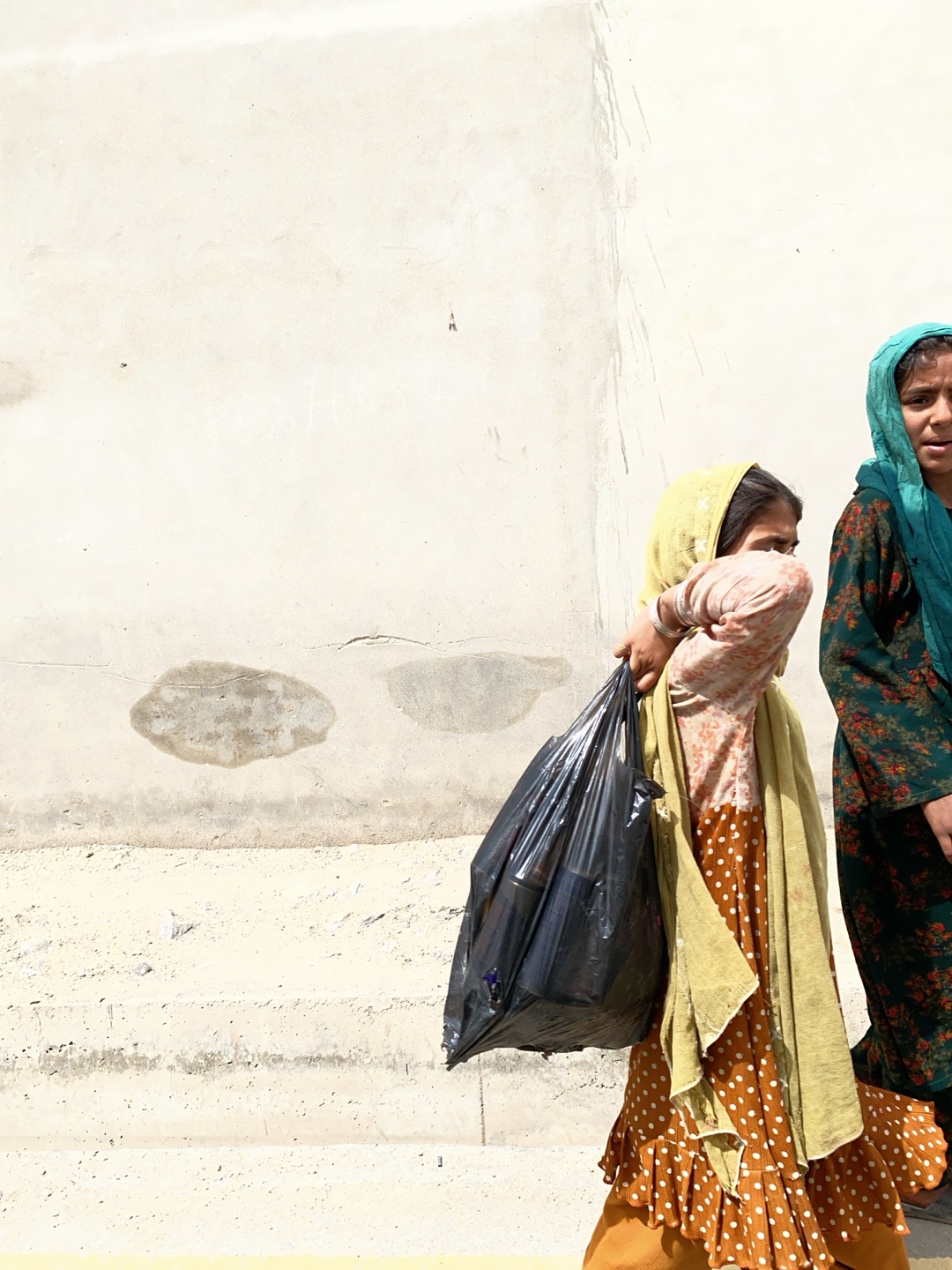 In Kandahar, Afghanistan, two young girls are walking along a wall. The girl in the foreground carries a large black plastic bag filled with objects, its contents slightly visible. She wears a headsca…read more