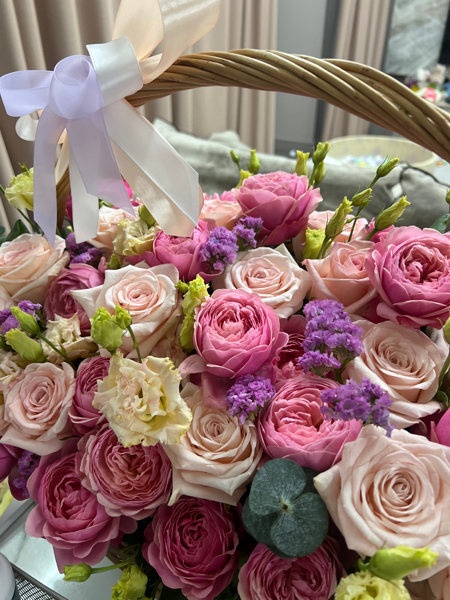 A close-up shot showcases a floral arrangement within a woven basket. The flowers primarily consist of roses in shades of pink and pale peach, interspersed with small clusters of purple blossoms. A wh…read more