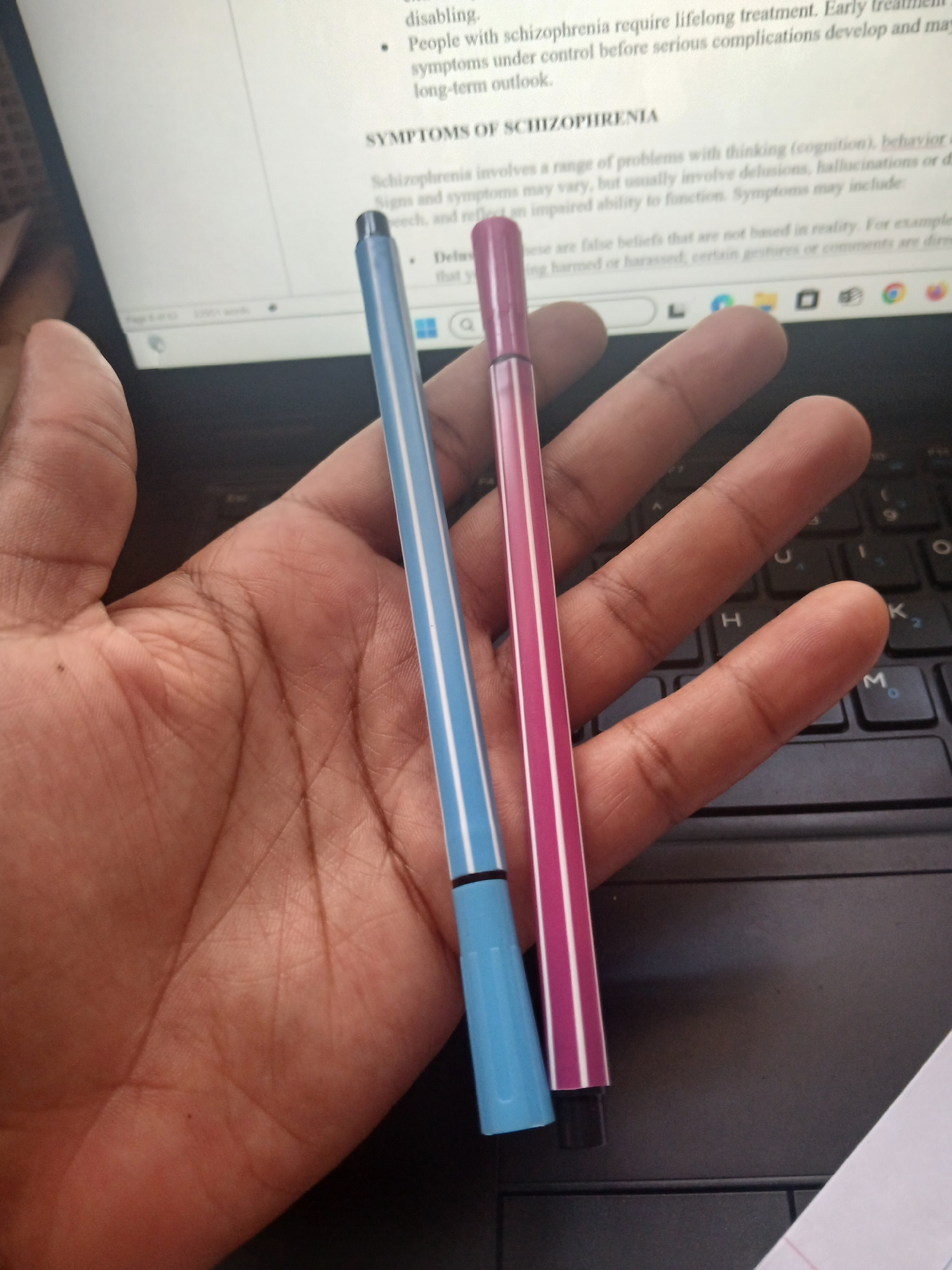 A hand holds two pens - a pink and white striped pen and a blue and white striped pen - over a laptop keyboard. The laptop screen displays text about schizophrenia. The scene appears to be indoors, po…read more