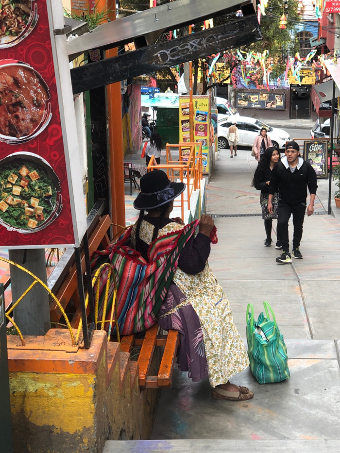 A street scene features a vendor seated on orange steps, adorned in a black hat and colorful textile, with a yellow floral dress visible. Overhead, a young couple in dark clothing walks past a green s…read more
