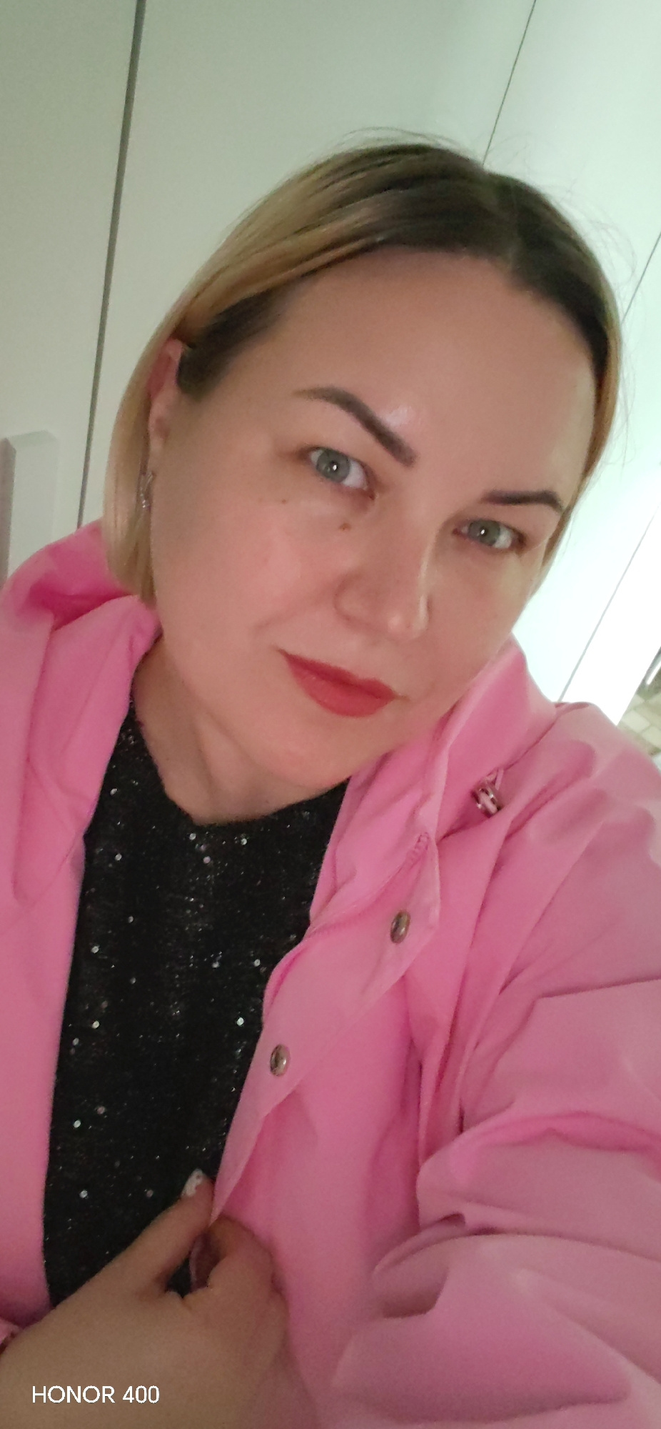 A close-up portrait captures a woman with light skin, short blonde hair showing darker roots, and green-blue eyes. She appears to be in her 40s. Her eyebrows are well-defined, and she wears red lipsti…read more