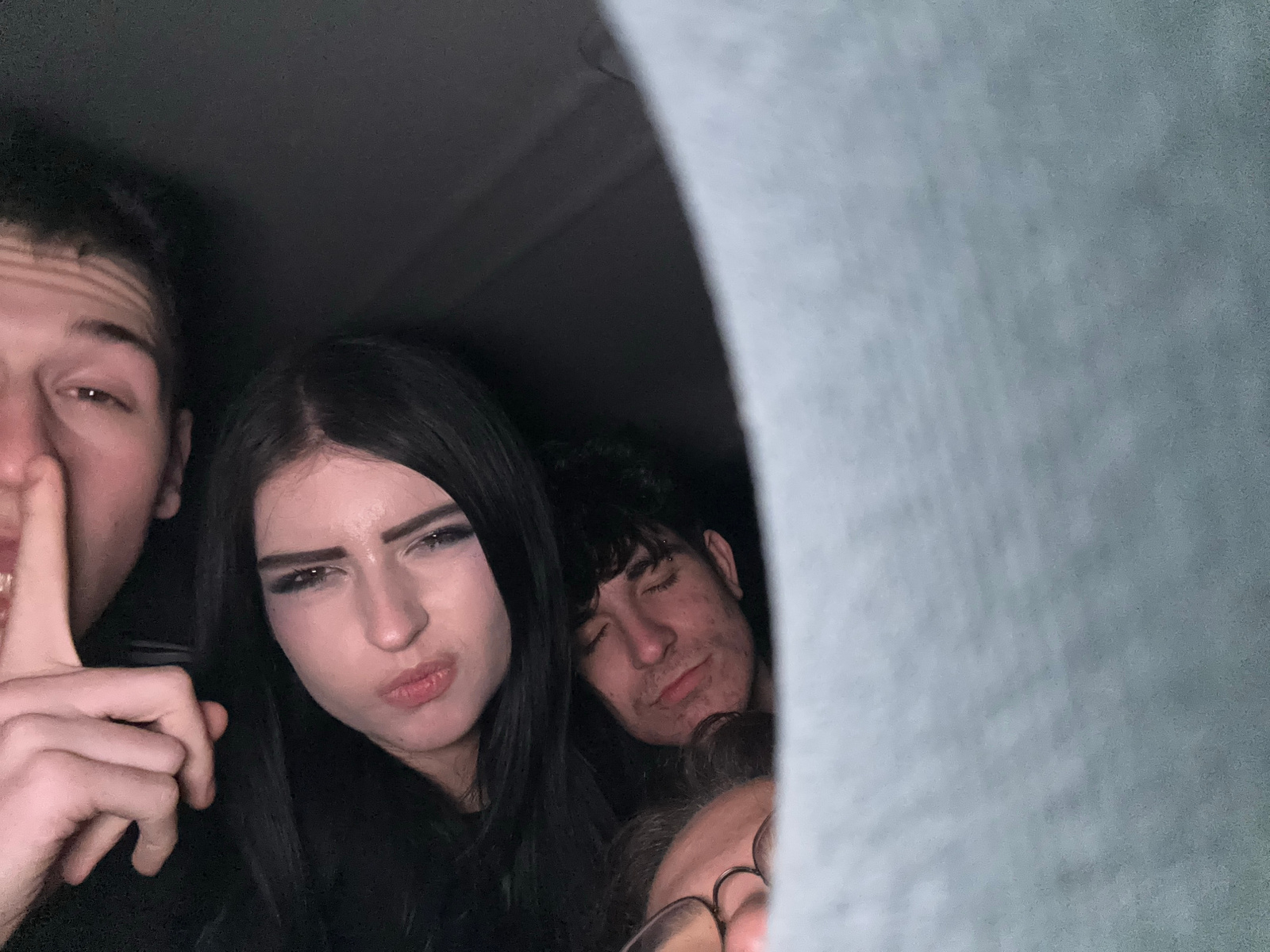 A close-up, upside-down photograph shows three people. A young woman with dark hair and heavy eyeliner is positioned centrally. To her left are two other people, a man with glasses and a man with shor…read more