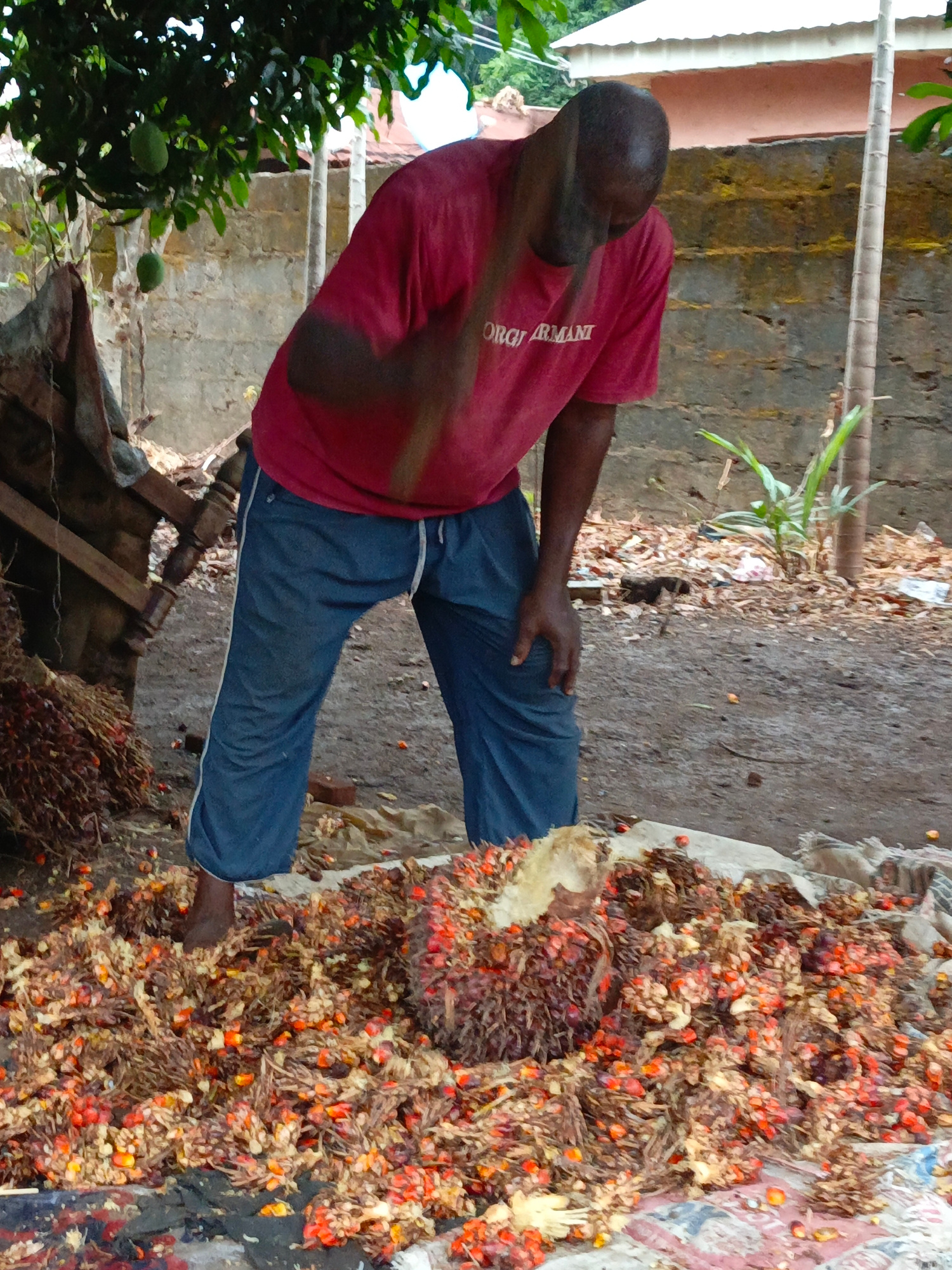In Akwanga, Nigeria, a dark-skinned bald man wearing a red t-shirt and blue pants is standing over a pile of palm fruit. He is using a tool to break apart the fruit. The fruit is scattered on a tarp l…read more