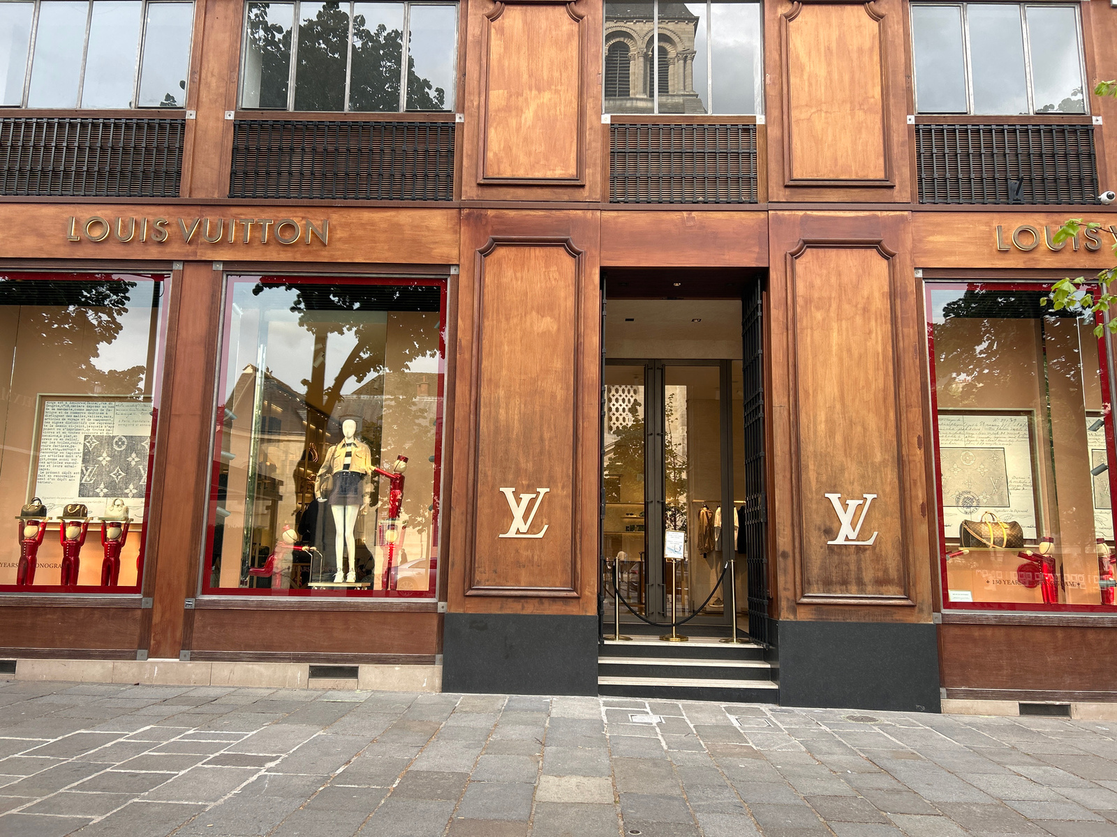 The image captures the facade of a Louis Vuitton store, likely in a city center. The building's exterior is predominantly brown wood, with large windows displaying mannequins and products. The store's…read more