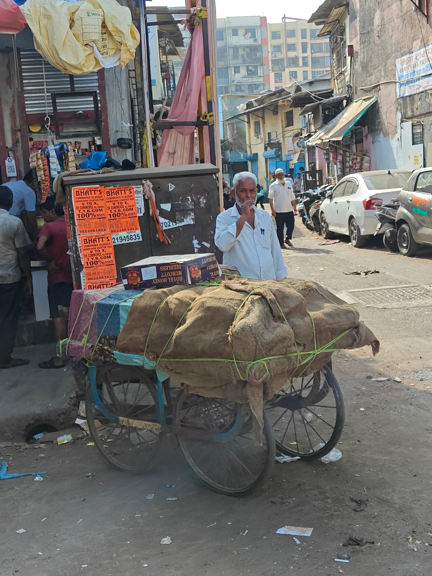 The image depicts a street scene in Mumbai, India. A vendor stands next to a heavily loaded cart covered in burlap sacks tied with green rope. The cart displays boxes labeled "ROYAL HONEY MURCOTT SEEDLESS CITRUS." The vendor, an older man with white hair, is wearing a light blue shirt. Behind him are advertisements for "BHATT'S COMMERCE CLASSES" with phone numbers. Other people are walking in the background, along with parked cars and scooters. The street is littered with trash. Buildings are visible in the background. | Open Wire