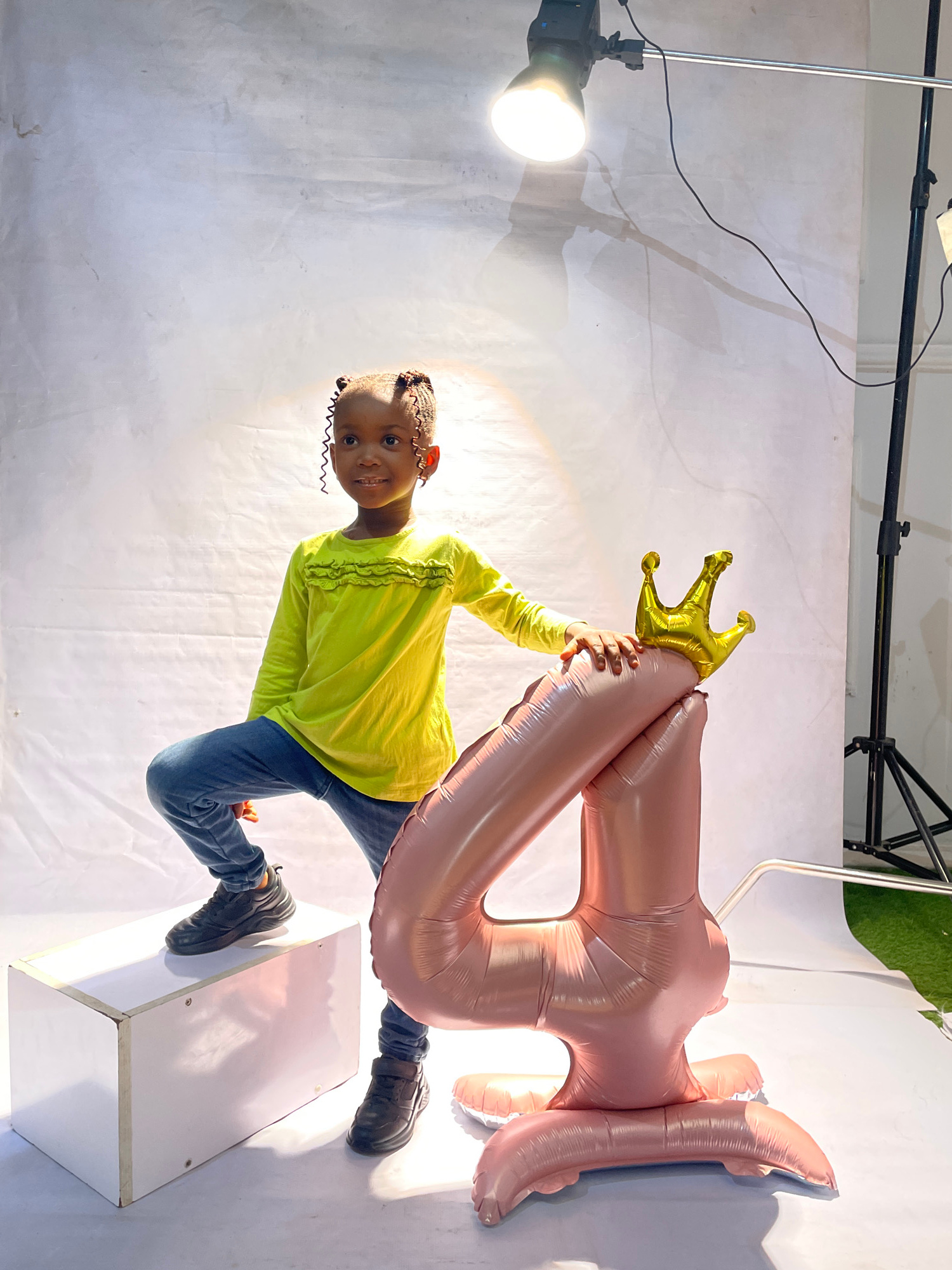 A young girl in a yellow long-sleeve shirt and jeans stands on a white box, holding a rose-gold balloon shaped like the number "4" topped with a gold crown. The setting appears to be a photography stu…read more