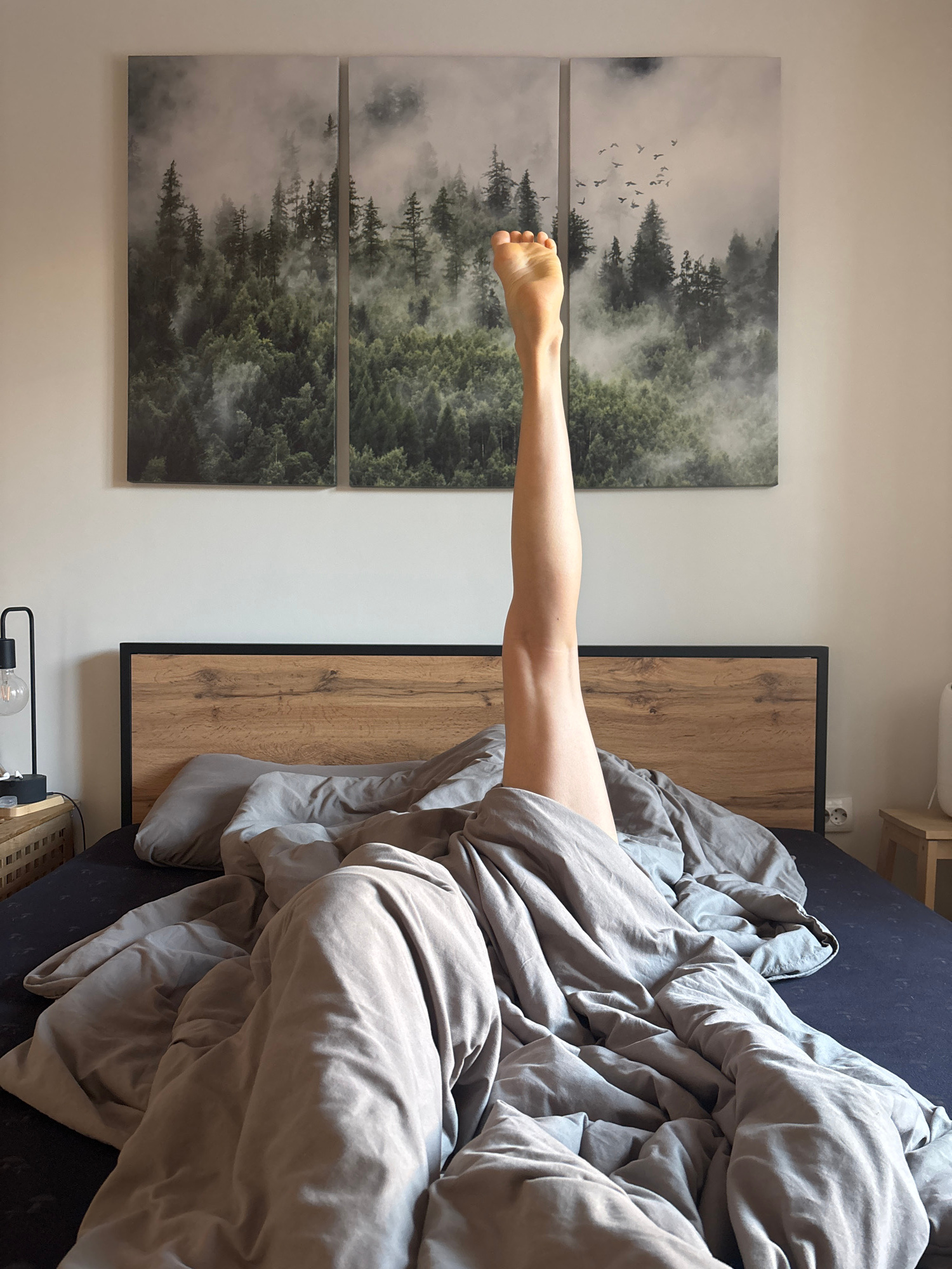A single, bare, pale leg extends from under a rumpled grey comforter on a bed. The foot points toward a triptych depicting a forest scene with mist and birds in flight. The bed has a headboard of ligh…read more