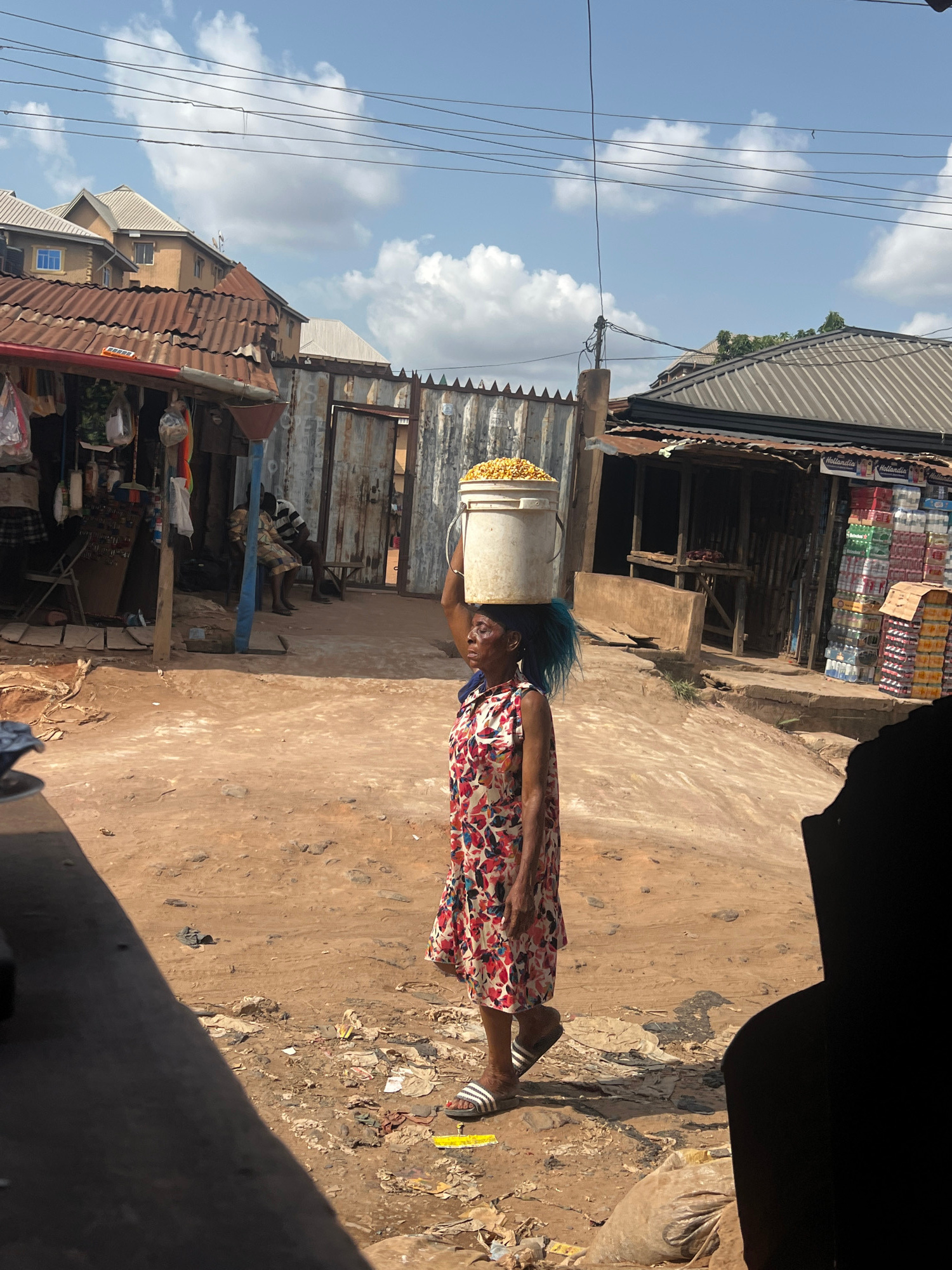 An elderly African woman carries a bucket of corn on her head down a dirt road in Onitsha, Nigeria. She wears a floral print dress and Adidas sandals. The road is lined with corrugated metal shacks se…read more