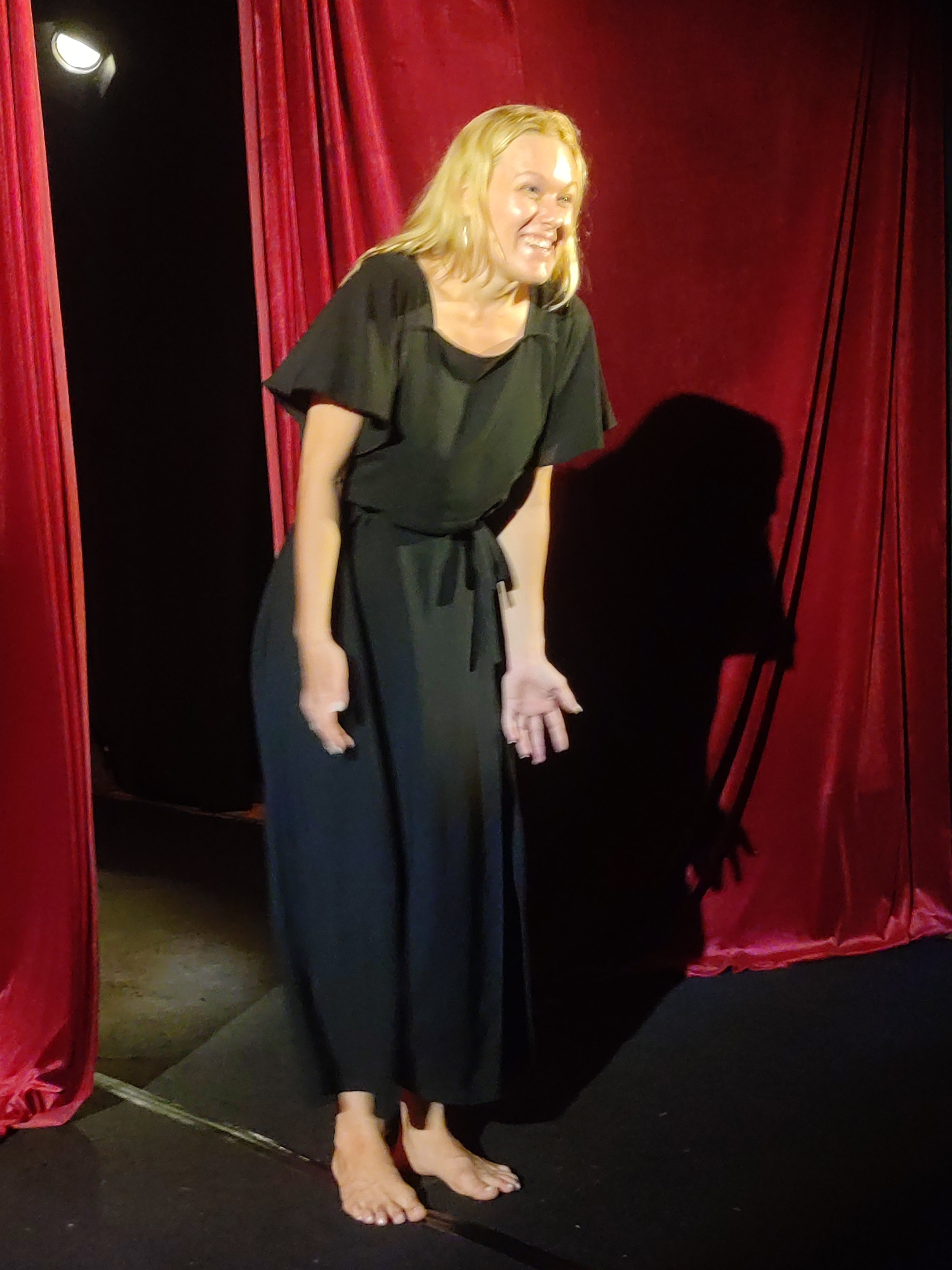 A woman with blonde hair stands barefoot in front of red curtains. She is wearing a black dress with a tie at the waist. Her hands are outstretched and she is smiling. The location is a stage in Bedul…read more