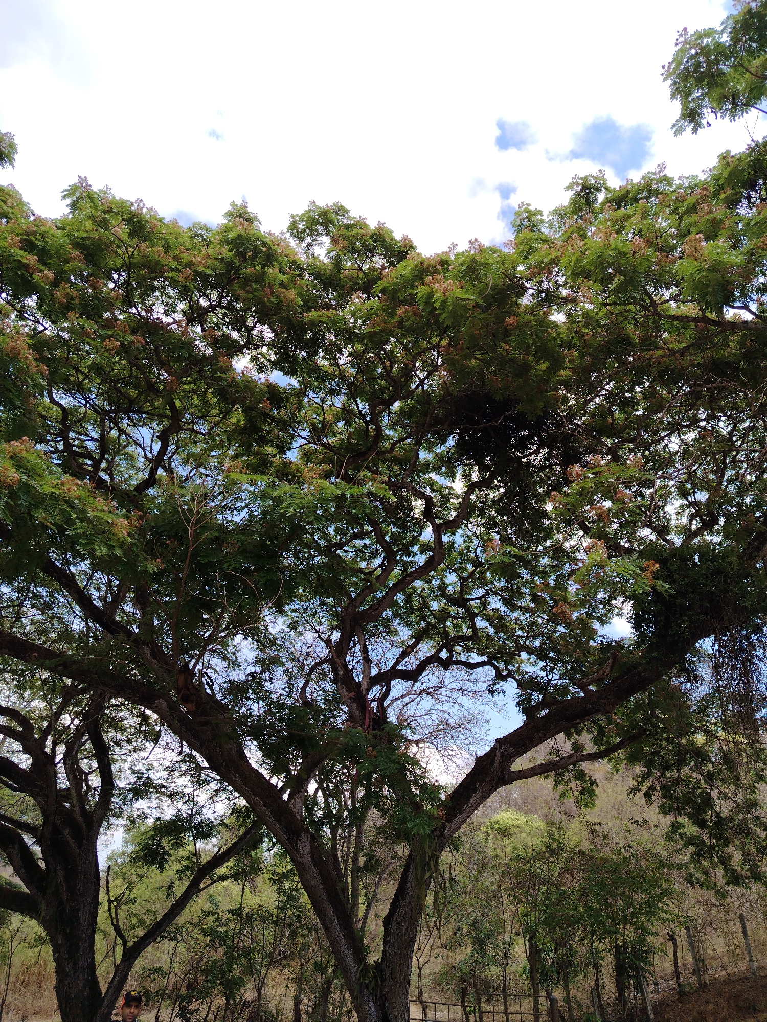 The photograph depicts a view looking up through a large tree canopy towards a blue sky with scattered white clouds. The trees are characterized by their extensive branches and dense foliage, creating…read more