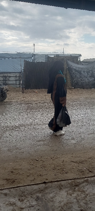 The image depicts an outdoor scene in Khan Yunis, Palestinian Territory, under an overcast sky. The ground is predominantly wet, muddy earth with numerous small puddles and granular debris, suggesting…read more