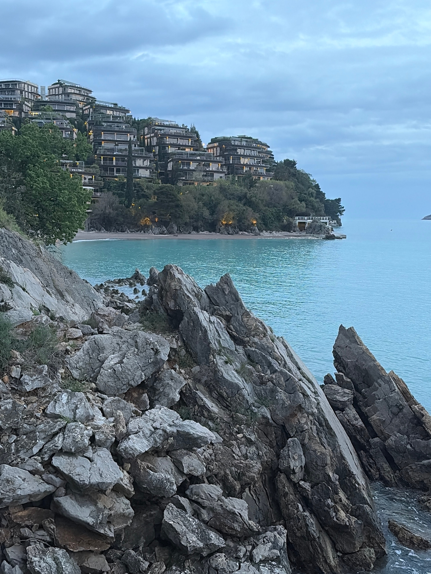 The image captures a coastal scene in Budva, Montenegro, showing a view of a rocky coastline and the Adriatic Sea. The foreground is dominated by large, gray rocks and cliffs, which appear rugged and…read more
