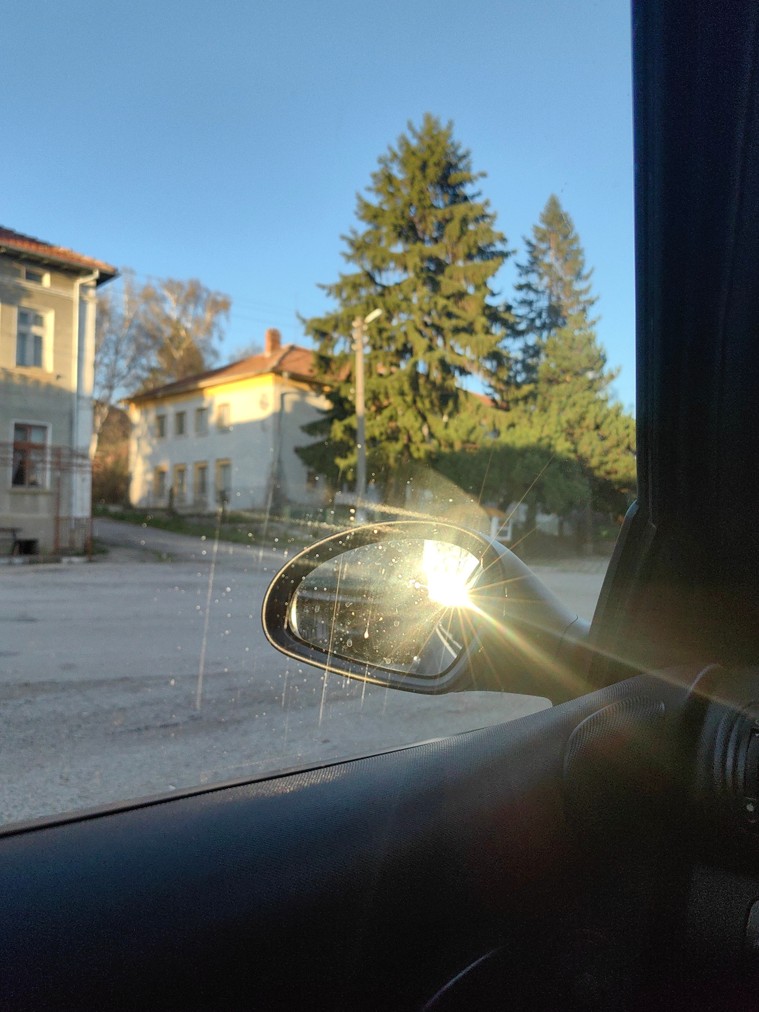 View from inside a car parked in Hirevo, Bulgaria, facing west with the sun reflecting off the side mirror. Two residential buildings are visible in the background. There are a few pine trees and othe…read more