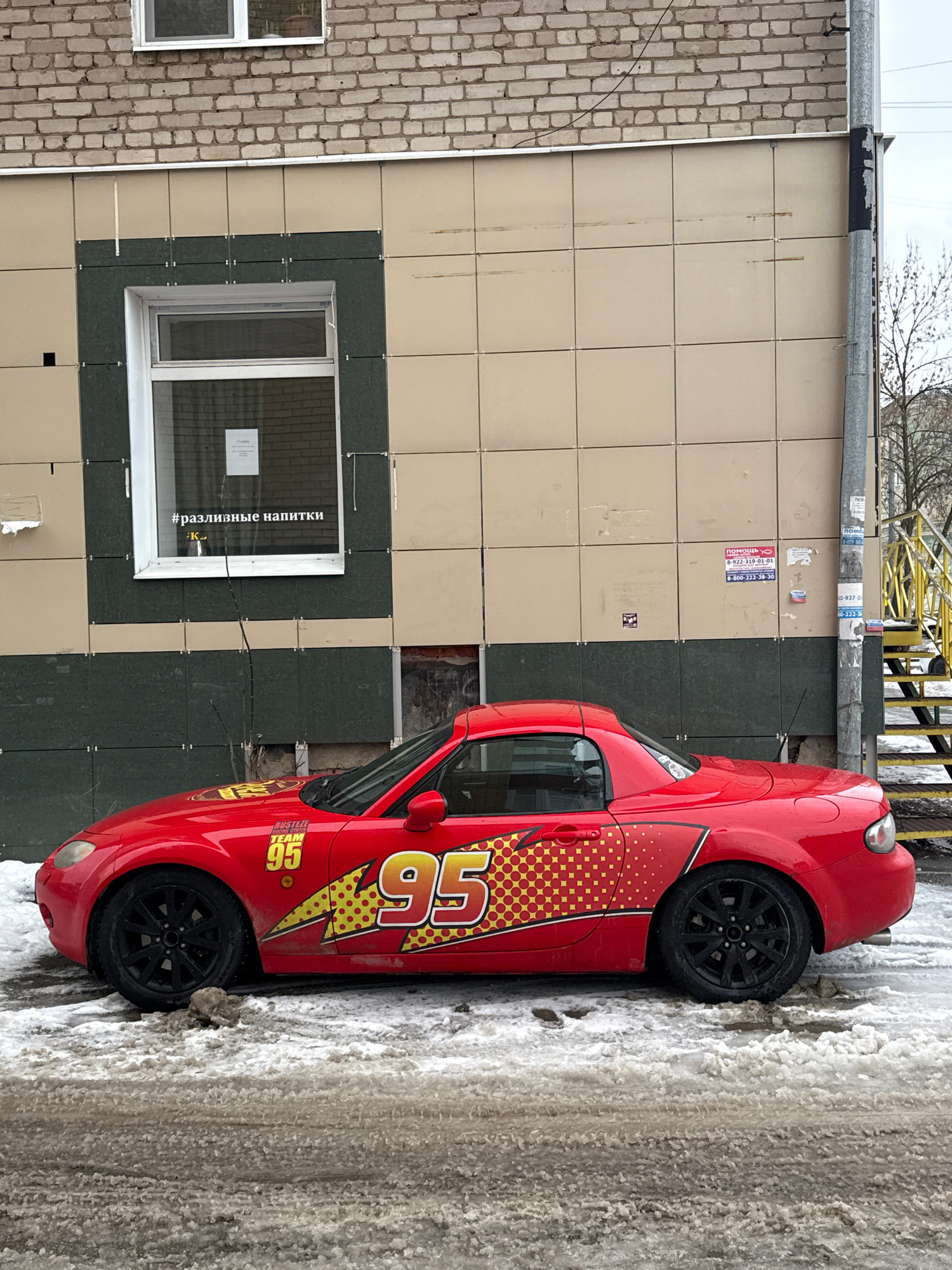 A red Mazda Miata, customized with "Cars" movie Lightning McQueen decals and the number "95", is parked on a slushy street next to a building. The building has a mix of light-colored tiles and dark gr…read more