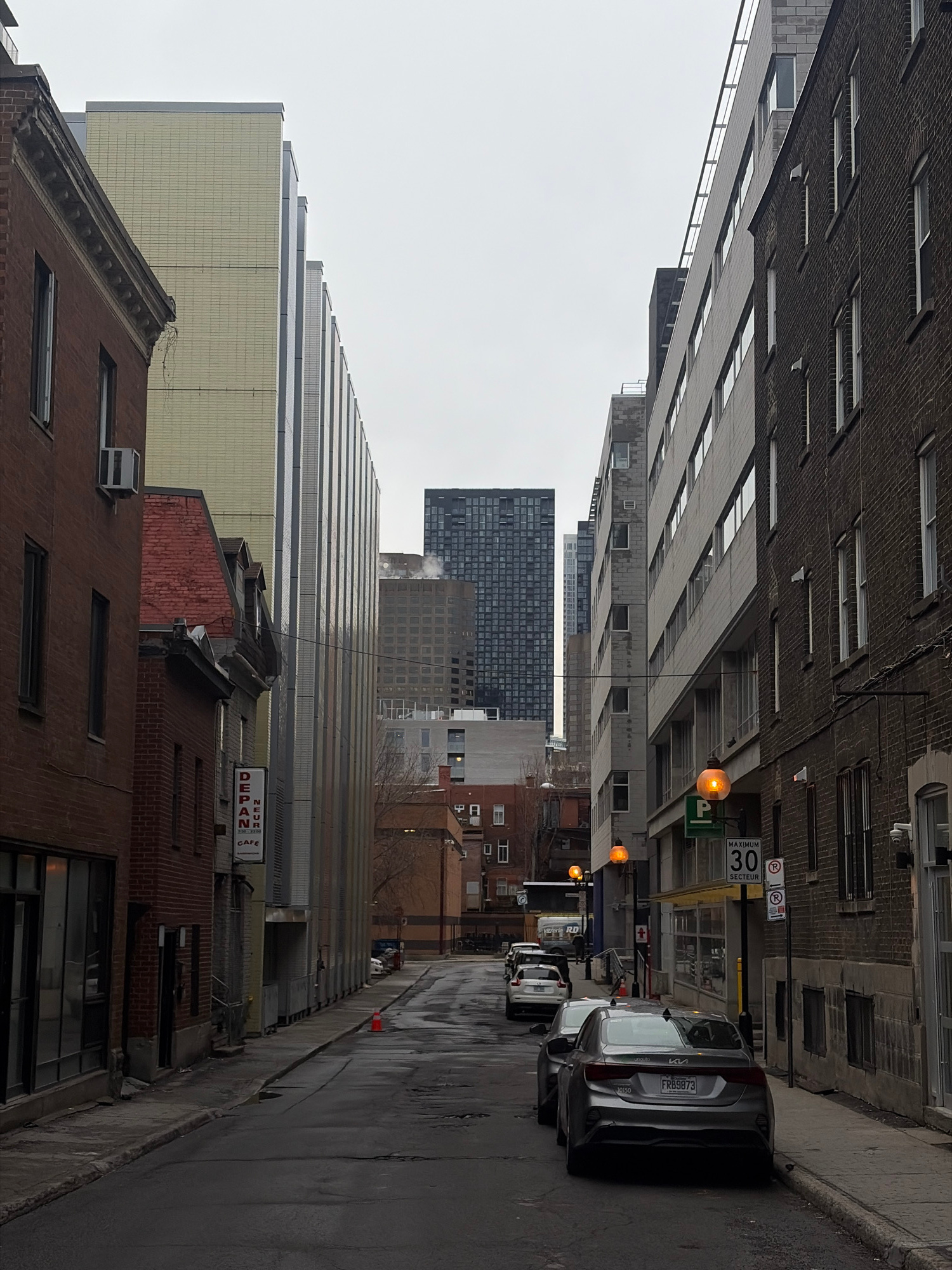 This image captures an urban street scene in Montreal, Canada, on an overcast day, evident by the muted lighting and wet street surface. The perspective looks down a street lined with a diverse archit…read more
