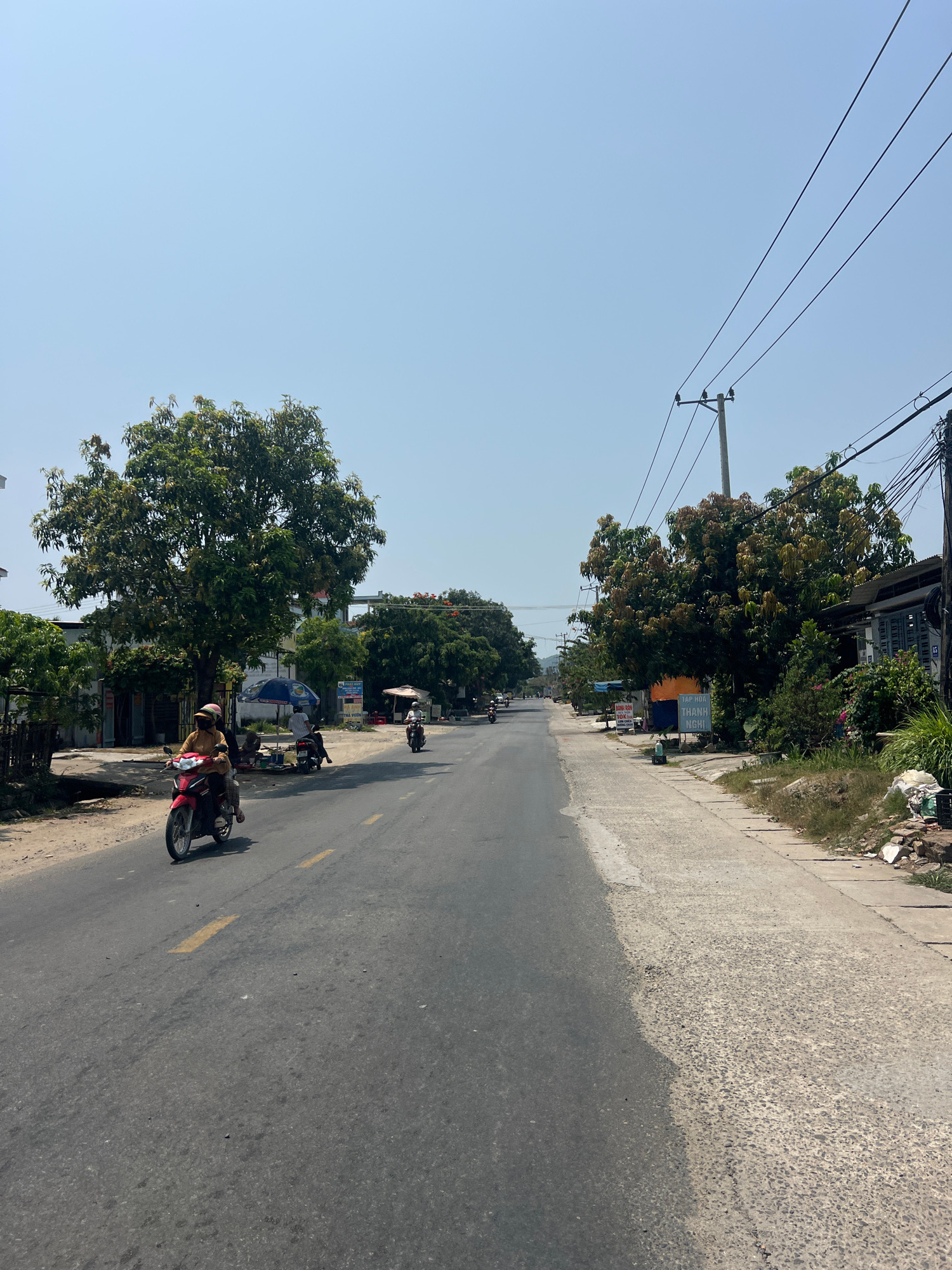 The image depicts a street scene in Bắc Nha Trang, Vietnam. A paved road stretches into the distance, lined with trees on both sides. Overhead power lines are visible against a clear sky. Several moto…read more
