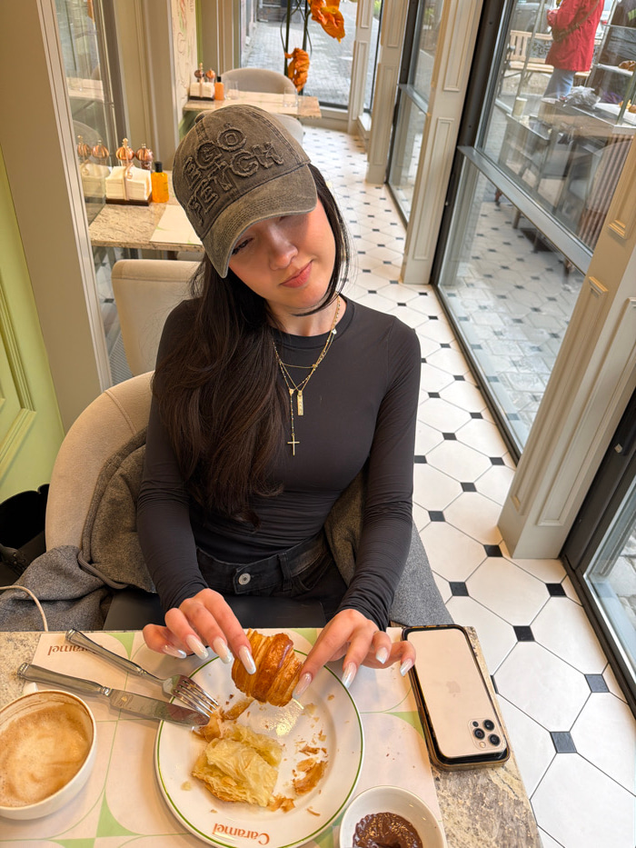 A female subject is seated at a light-colored marble table inside a cafe, facing the camera. She wears a distressed olive-green baseball cap with raised lettering, a fitted black long-sleeved top, and…read more