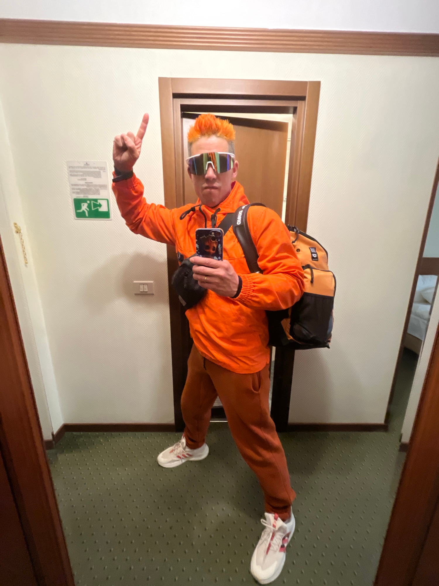A person wearing an orange tracksuit, futuristic sunglasses, and white sneakers with red stripes is taking a selfie in a mirror. The person has orange hair and is pointing with their left hand. They a…read more