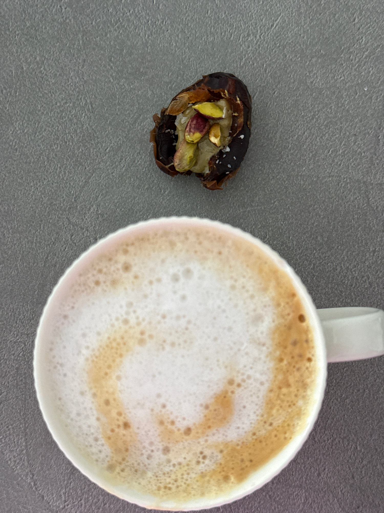 An overhead shot captures a simple arrangement of food and drink on a textured grey surface. To the right, a white ceramic mug, with its handle partially visible, contains a frothy coffee beverage, li…read more