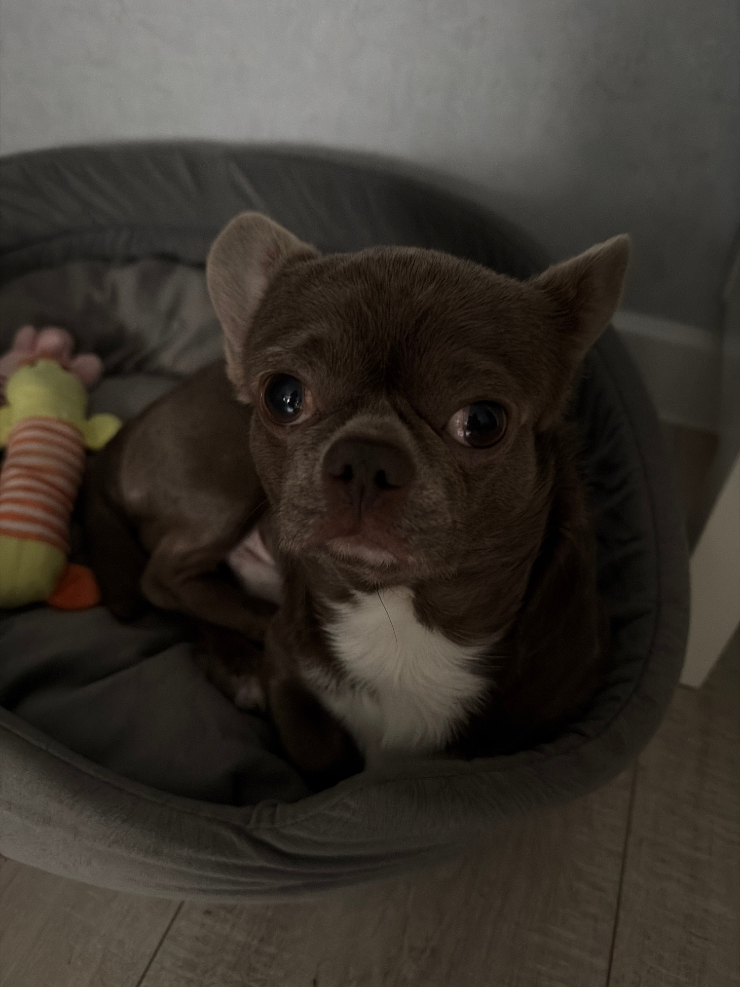 A brown and white Chihuahua dog is lying in a gray dog bed, looking up at the camera. The dog has a toy with green and orange stripes at its feet. The floor is a light wood-grain. The exact location i…read more