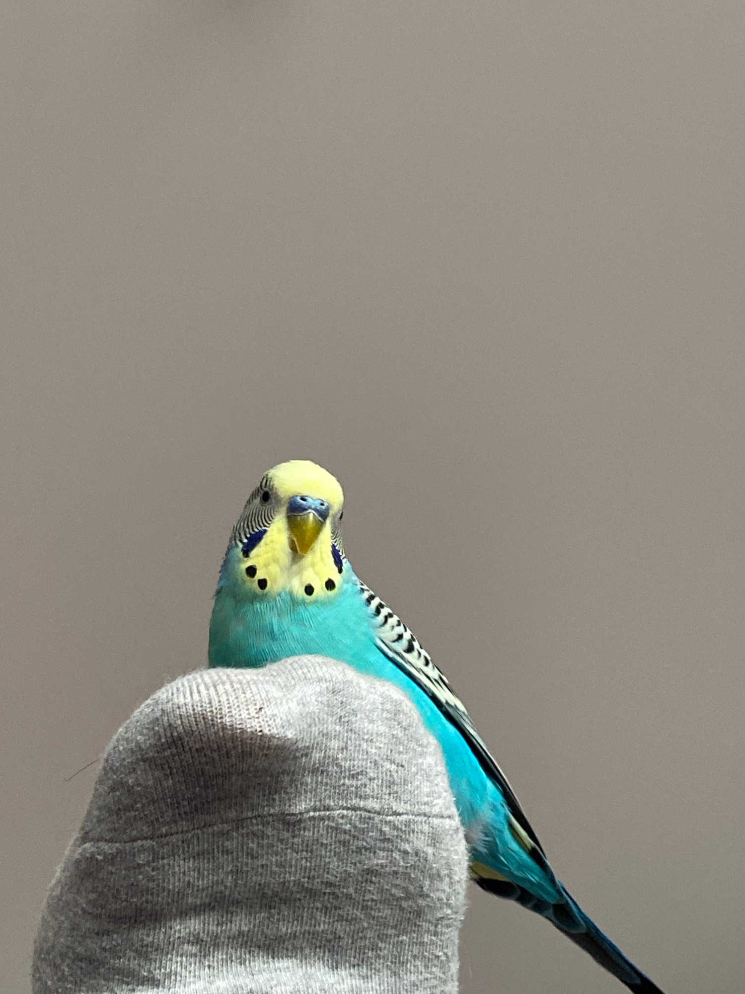 A blue and yellow budgerigar perches upside down on a gray, textured object. The background is a plain gray surface. The location is Unknown, Unknown.
