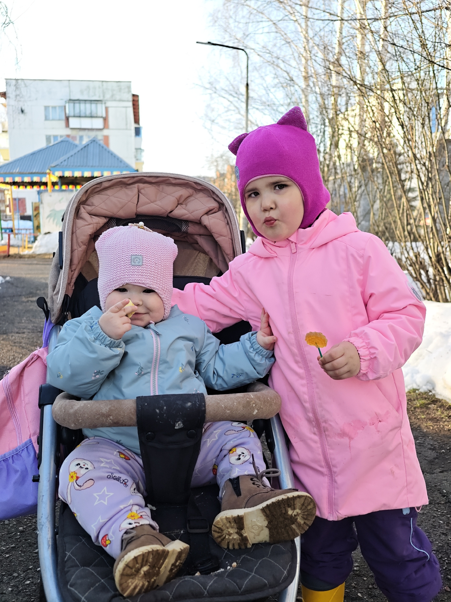Two young children are outdoors. One child, wearing a pink knit hat and light blue jacket, sits in a stroller and holds a piece of food in their hand. The other child, wearing a purple knit hat with cā¦read more