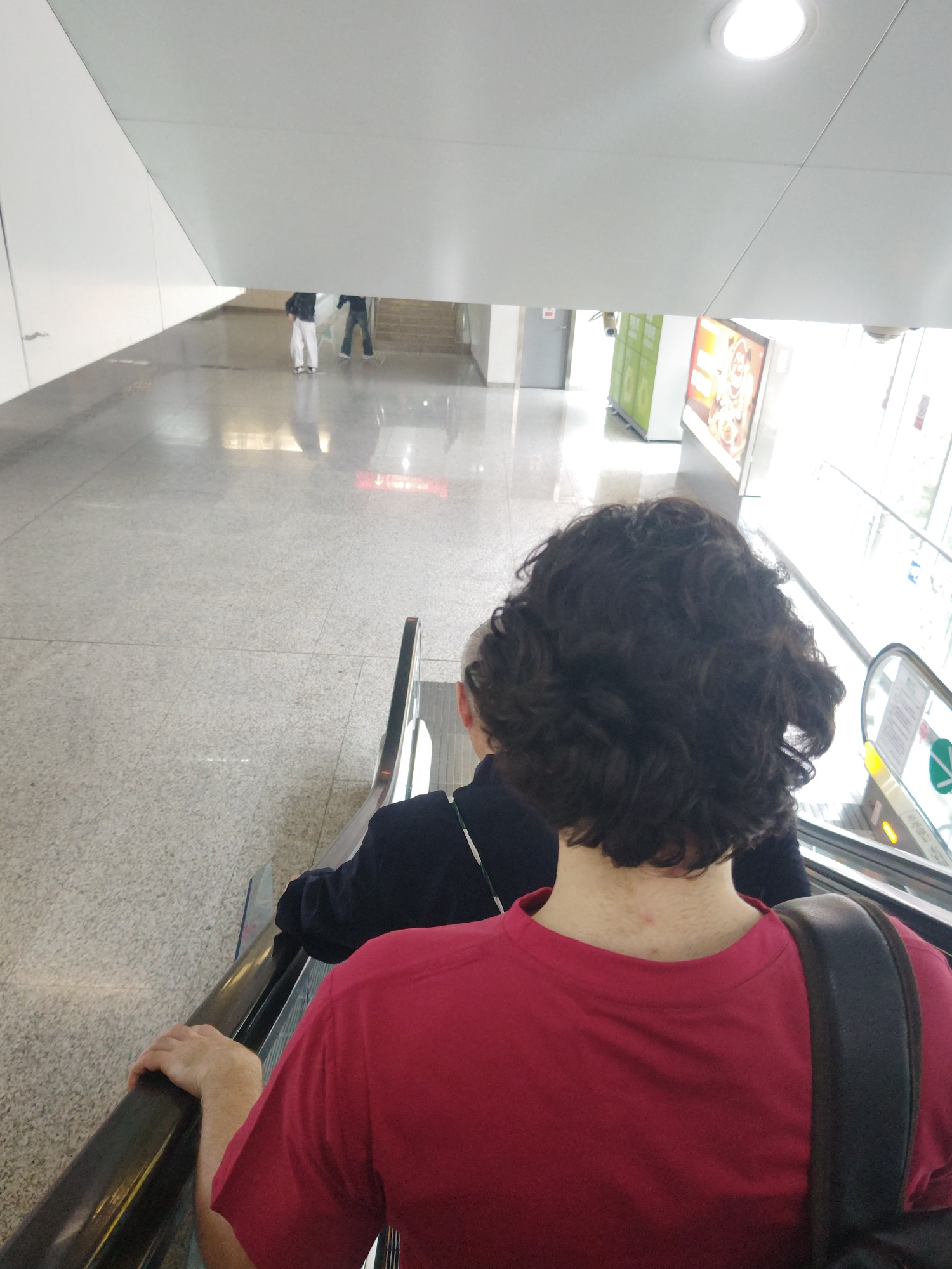 Here's a detailed description of the image: **Scene Overview:** The image appears to be taken from a slightly elevated perspective, possibly on an escalator. The focus is on a person riding the esca…read more