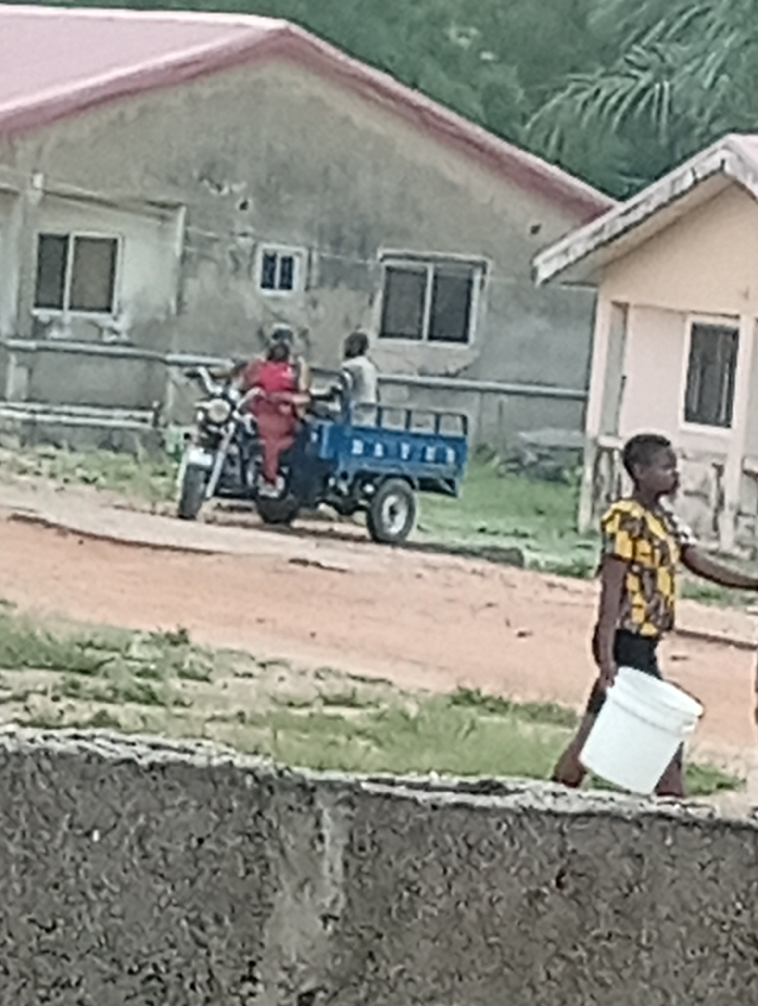 In Adankolo, Nigeria, a boy carrying a white bucket walks towards the camera. Behind him, a three-wheeled motorcycle with two people is parked on a dirt road in front of houses. The houses have multip…read more