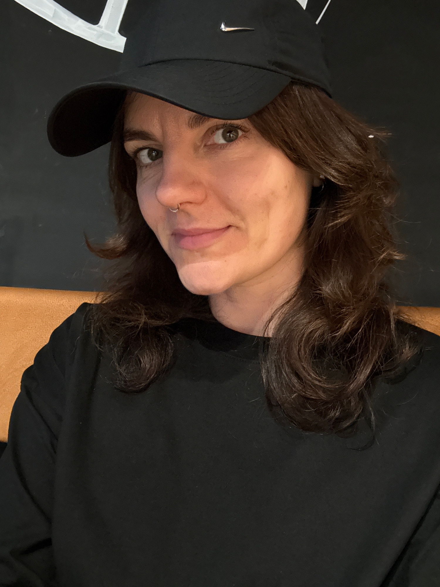 A woman with dark brown, curly hair and light skin is wearing a black Nike baseball cap and a black shirt. She has a nose ring on her left nostril. The background appears to be a black wall with a par…read more