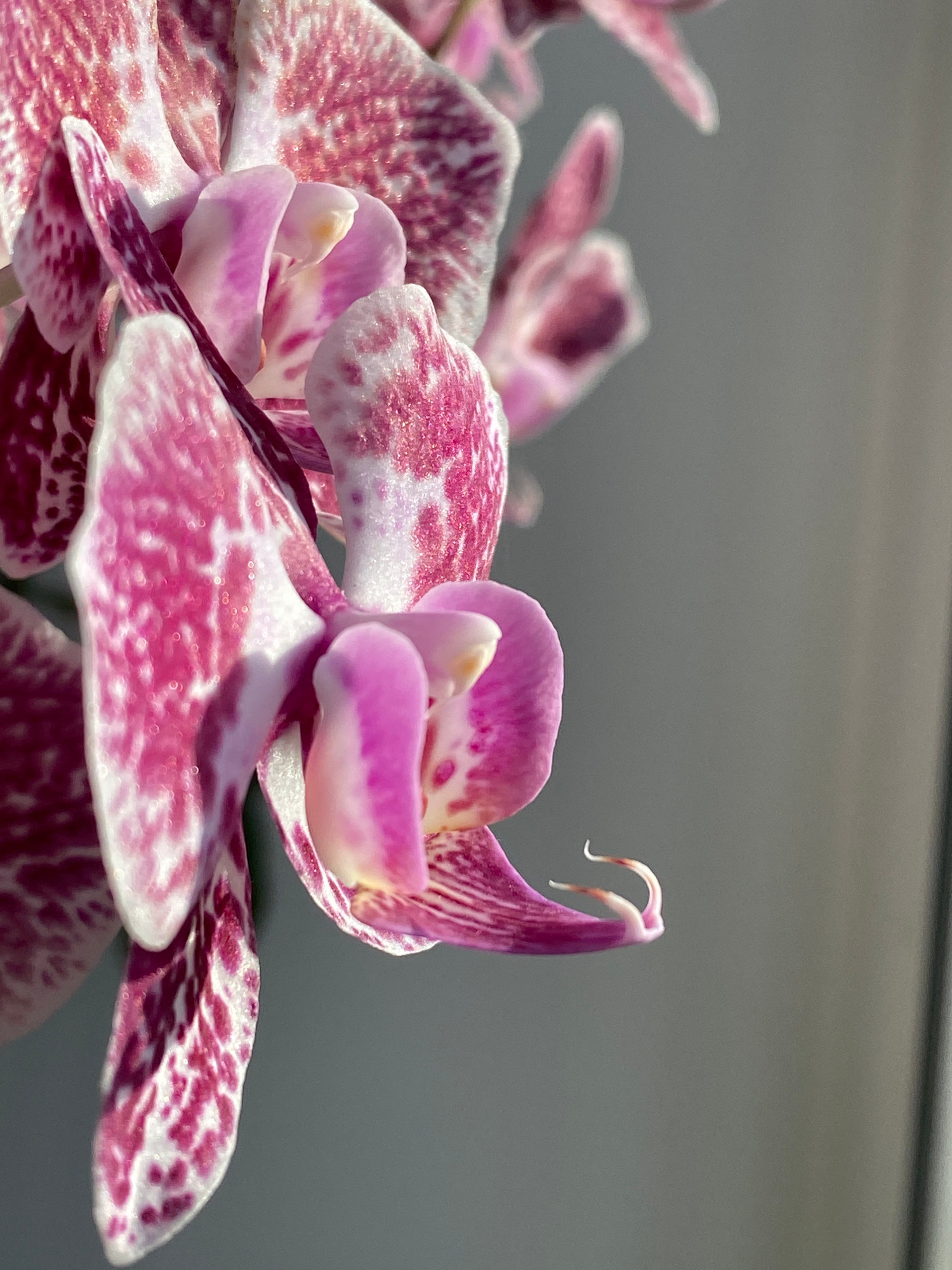 This close-up photograph features vibrant pink and white speckled orchid flowers against a soft, uniformly blurred grey background. The primary subject is a single orchid bloom, sharply in focus in th…read more