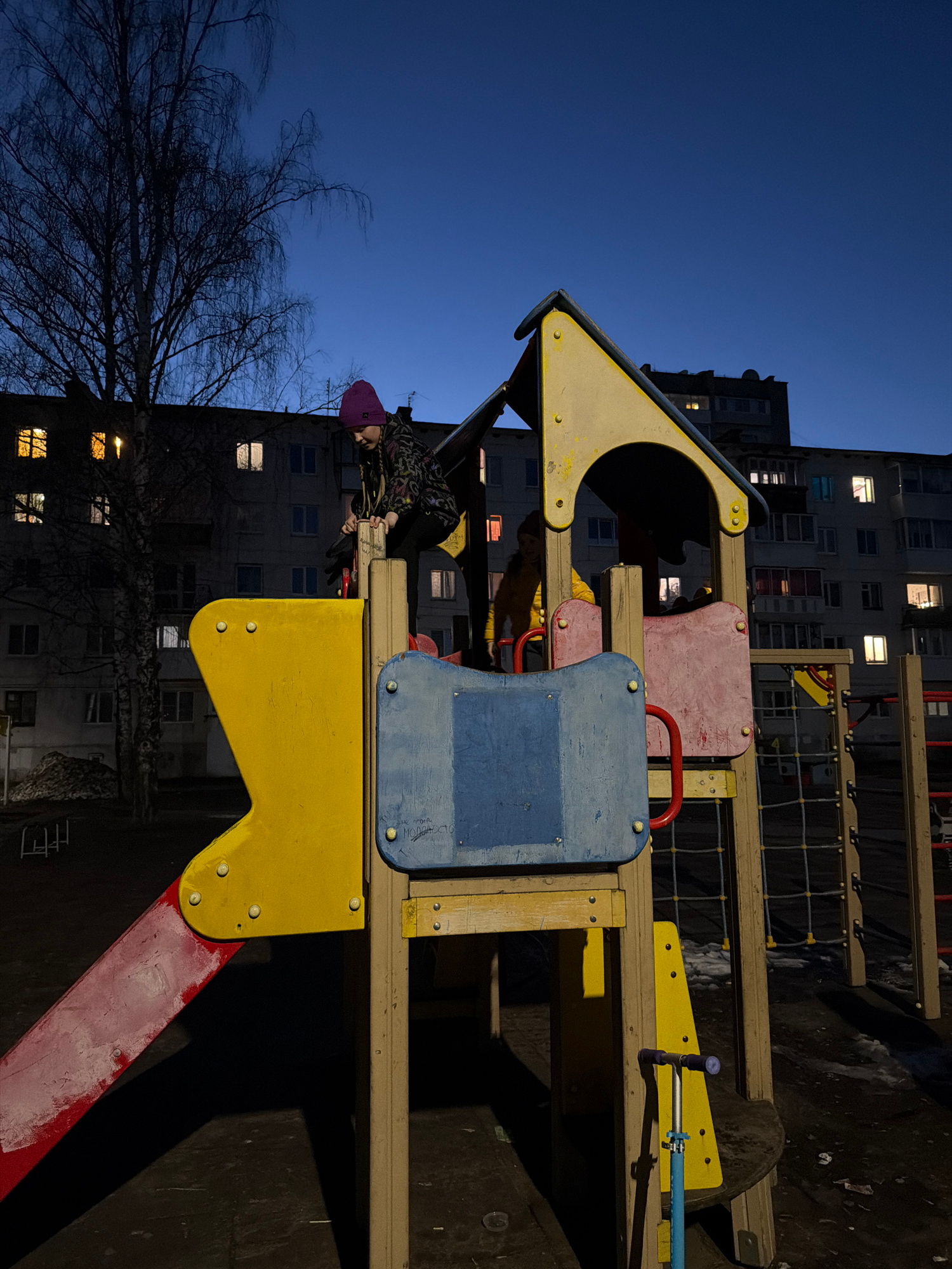 A child wearing a pink hat and patterned jacket is perched on a playground structure. The structure is made of wood and colorful plastic components in shades of yellow, blue, and red. The structure ap…read more