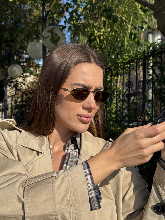 An outdoor, sunlit, close-up shot features a single female subject in Sirmione, Italy. She possesses medium brown, straight hair and wears small, oval-framed sunglasses with dark amber lenses. Her eyebrows are slightly furrowed as she concentrates on a black electronic device, possibly a smartphone or compact camera, held with both hands in front of her. The device displays a silver power button and a circular button on its top edge. She is dressed in a light tan trench coat, under which a blue and white plaid shirt is visible at the cuffs and collar. The background, softly blurred, reveals lush green foliage, multiple spherical frosted glass street lamps mounted on a dark decorative pole, a dark wrought-iron fence with intricate scrollwork, and a light-colored building in the distance. The scene is brightly illuminated by direct sunlight, casting shadows. The environment suggests a public garden, park, or a well-maintained street area characteristic of Sirmione. | Open Wire