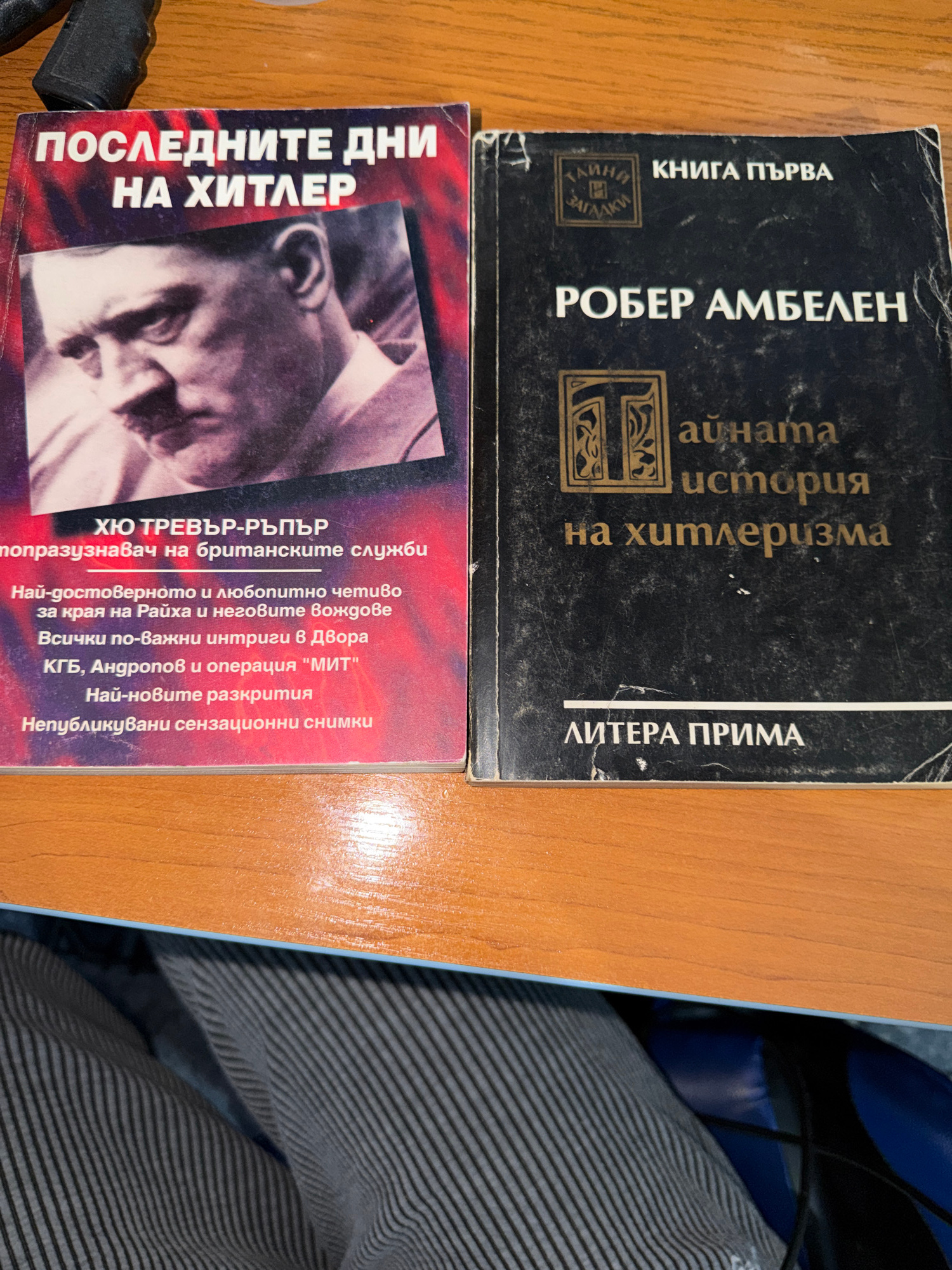 The image shows two books stacked on top of each other. The book on top is black and titled "ТАЙНА история на хитлеризма," authored by Робер Амбелен. It also says "ЛИТЕРА ПРИМА" and "КНИГА ПЪРВА." The…read more