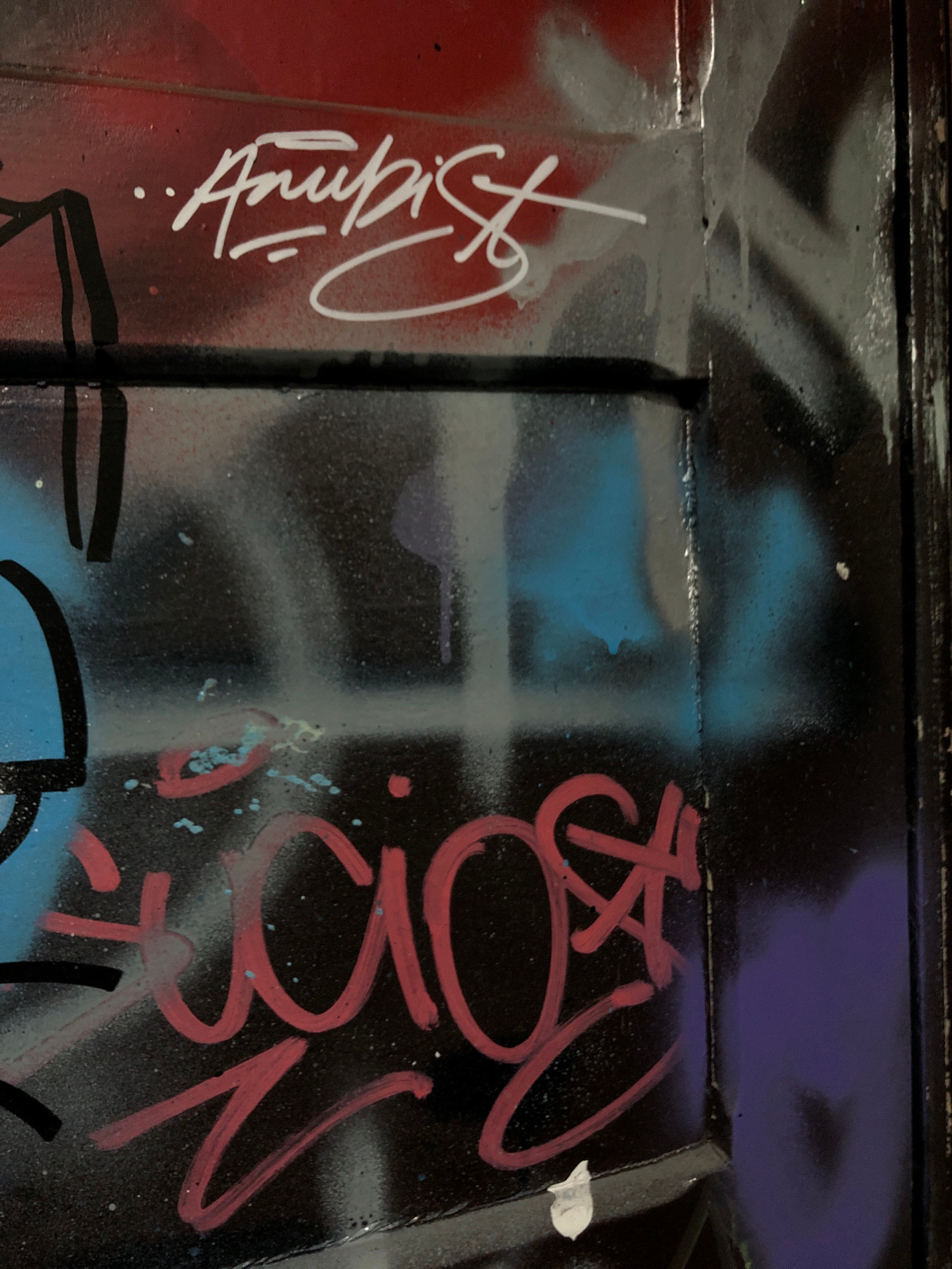 The image depicts a close-up view of graffiti on a rough, possibly metallic surface. The background is predominantly black with patches of blue, red, and purple paint. Overlaid on this backdrop are se…read more