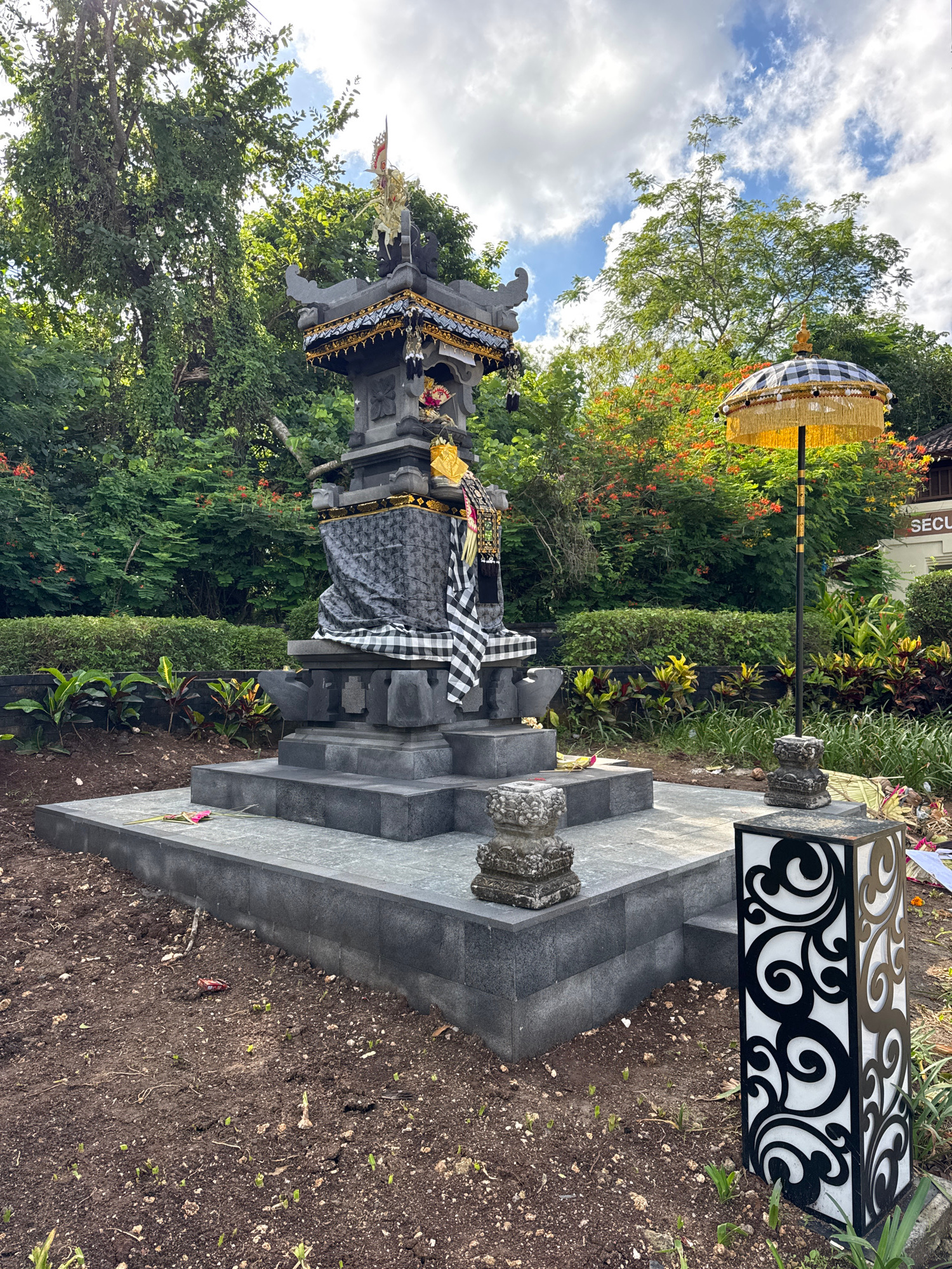 The image captures an outdoor scene in Kuta Selatan, Indonesia, featuring a traditional Balinese temple shrine and ceremonial elements under a bright, partly cloudy sky. In the center, a multi-tieredβ¦read more