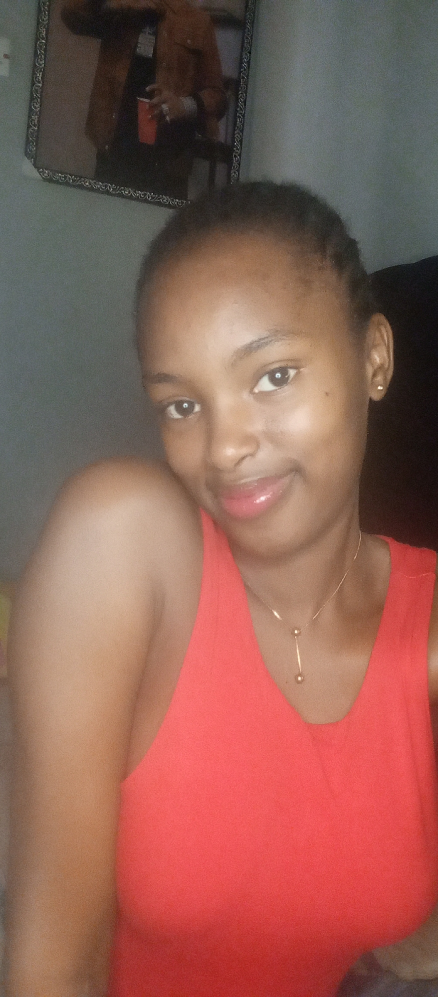 A young, dark-skinned woman is posing for a selfie indoors. She is wearing a red sleeveless top and a gold necklace. A framed picture hangs on the wall behind her. The location is Keffi, Nigeria.