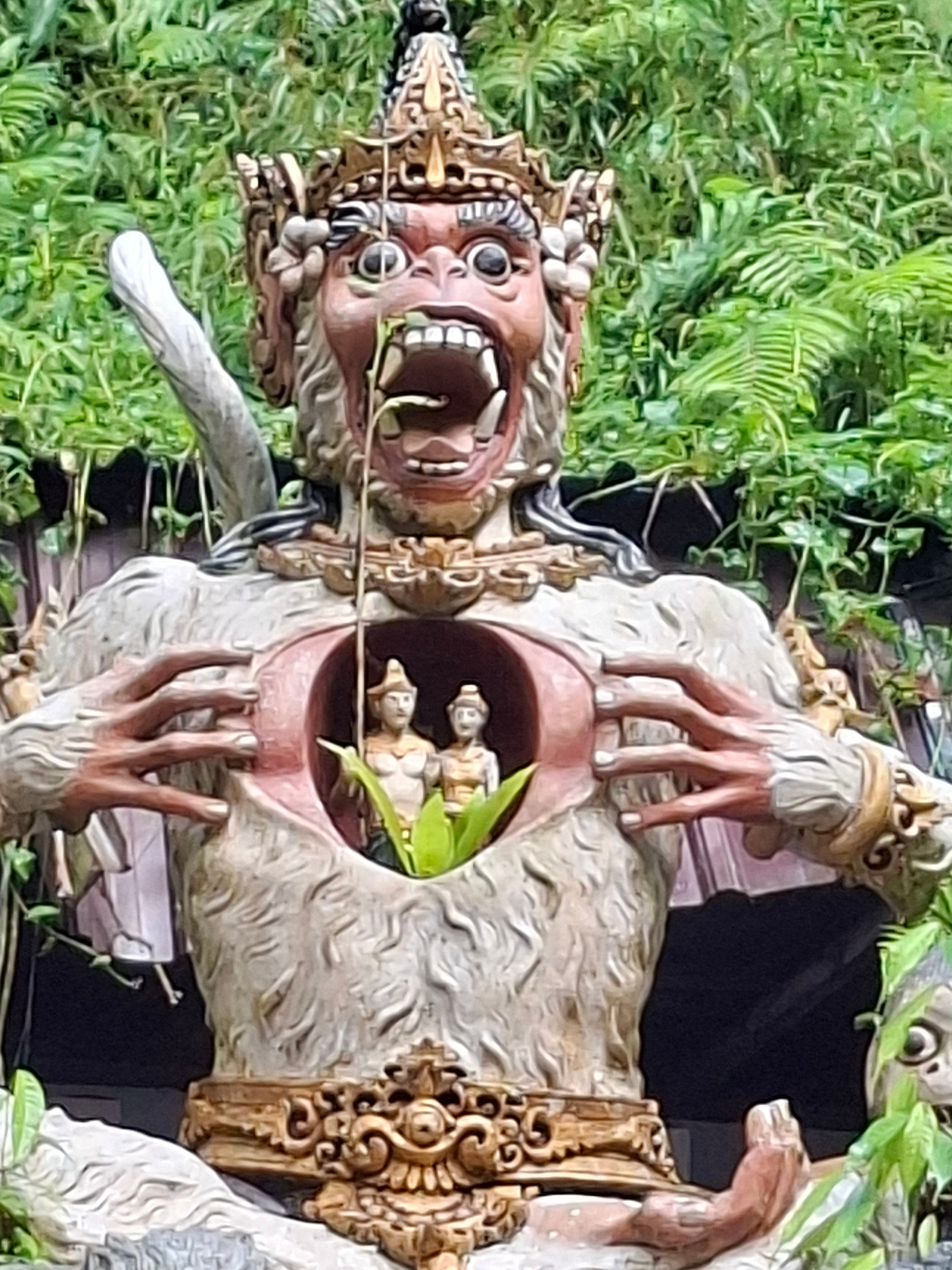 The image shows a Balinese demon statue. The statue has a prominent mouth with exposed teeth, large eyes, and detailed headgear. The body has a cavity containing smaller figures and some greenery. The…read more