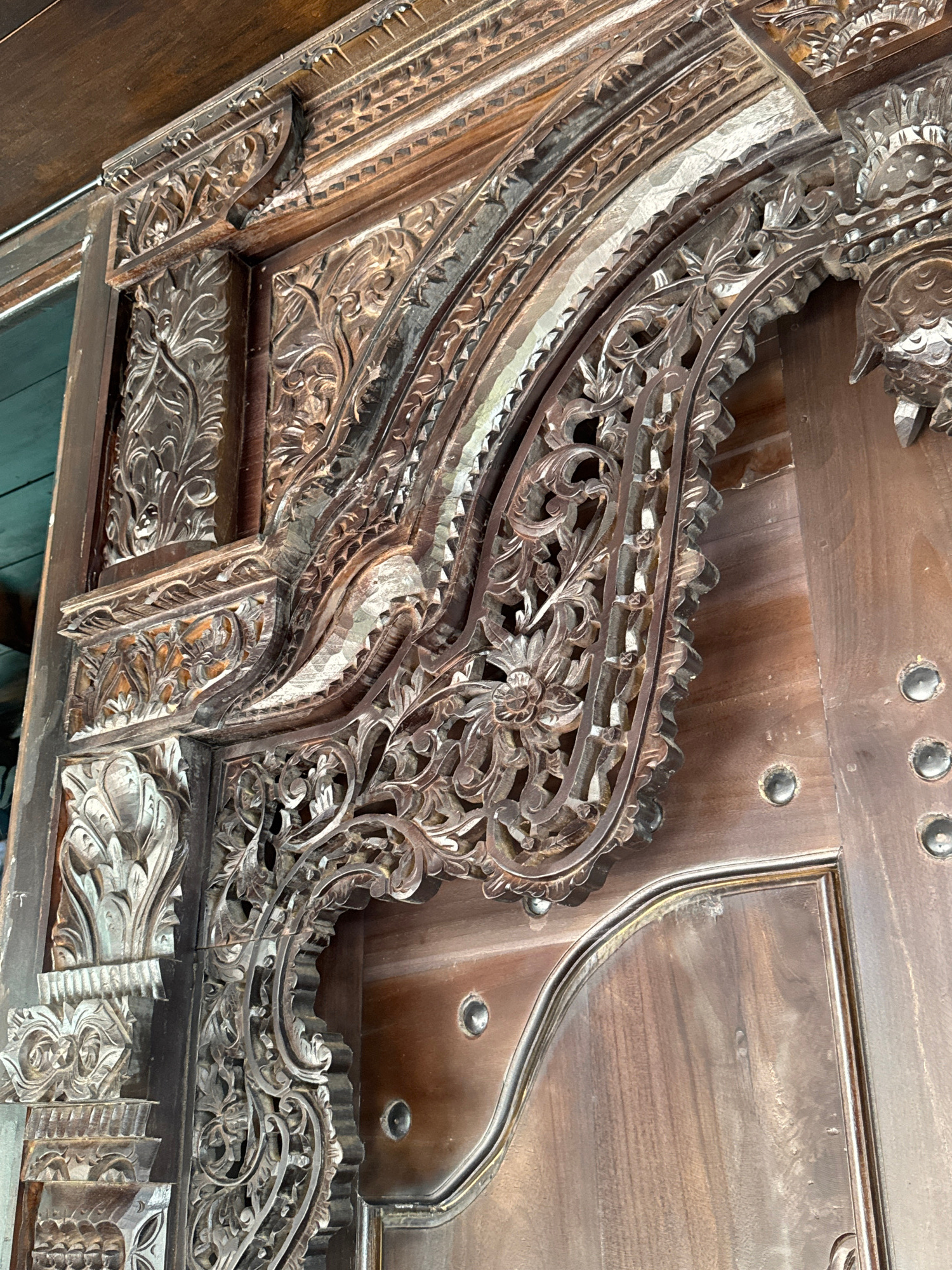 Detailed view of intricately carved dark brown wooden panels, likely part of a door or furniture, showcasing detailed floral and geometric patterns. The location is in Ungasan, Indonesia, as inferred…read more