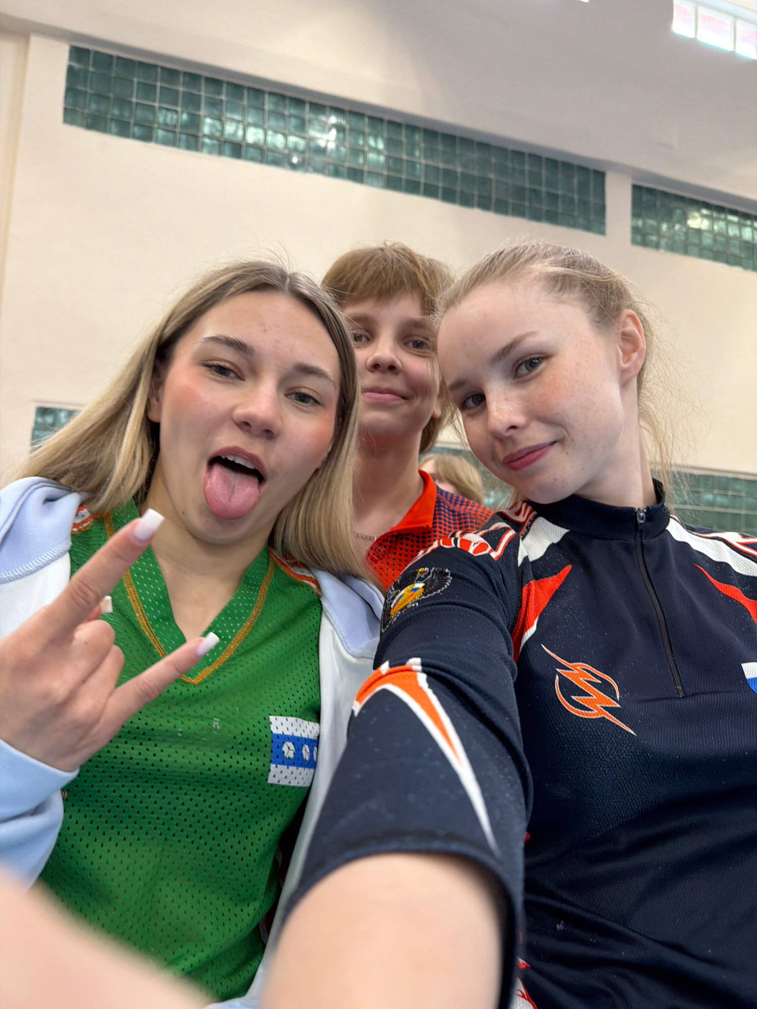 Three young women are taking a selfie in a building with windows made of green glass blocks. The bottom woman sticks out her tongue and makes a "rock on" hand gesture. She wears a green jersey with a…read more