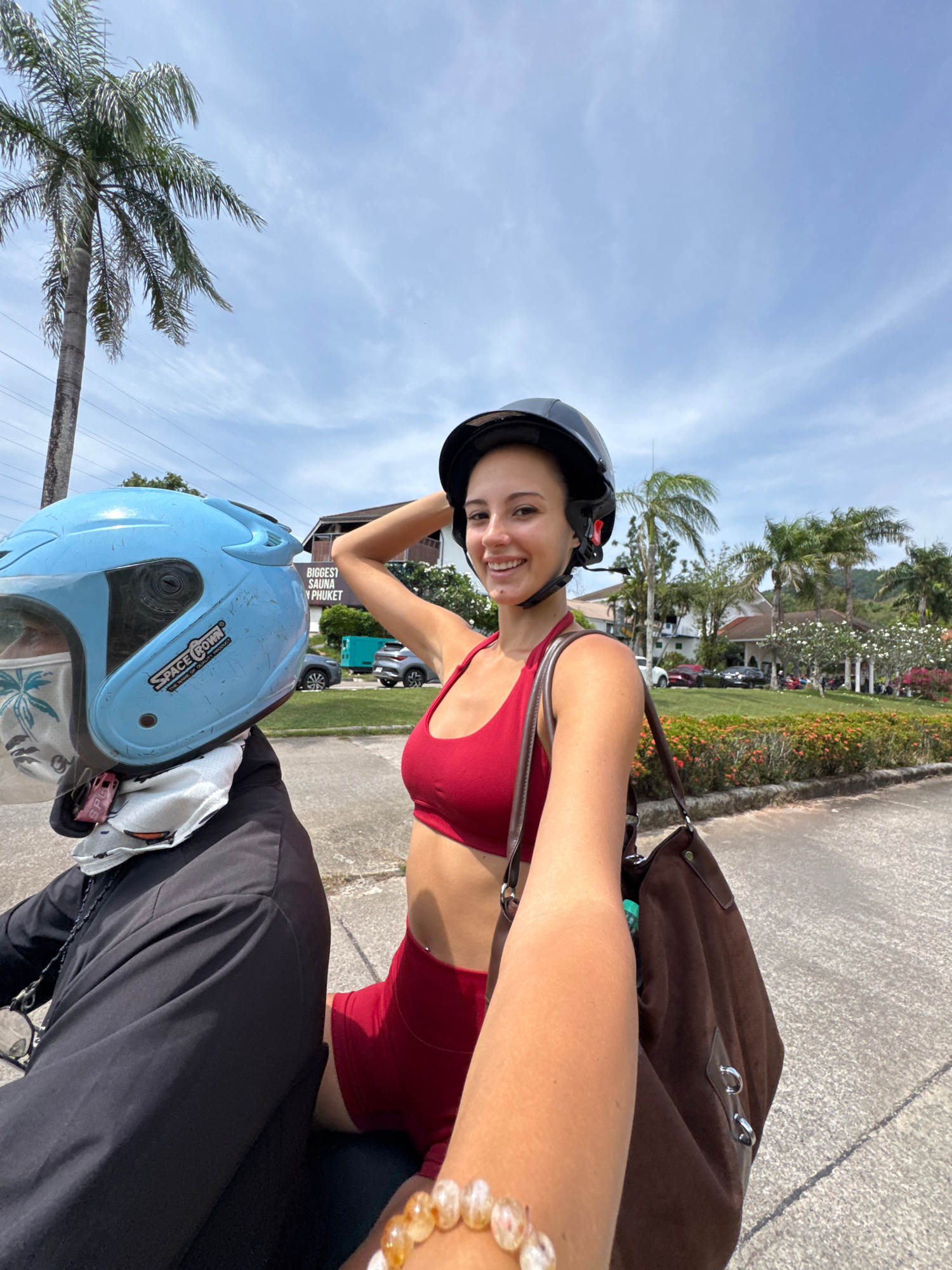 A woman in a red athletic outfit and a black helmet is smiling and taking a selfie while sitting on a scooter in Kathu, Thailand. Another person wearing a light blue helmet is in front of her on the s…read more
