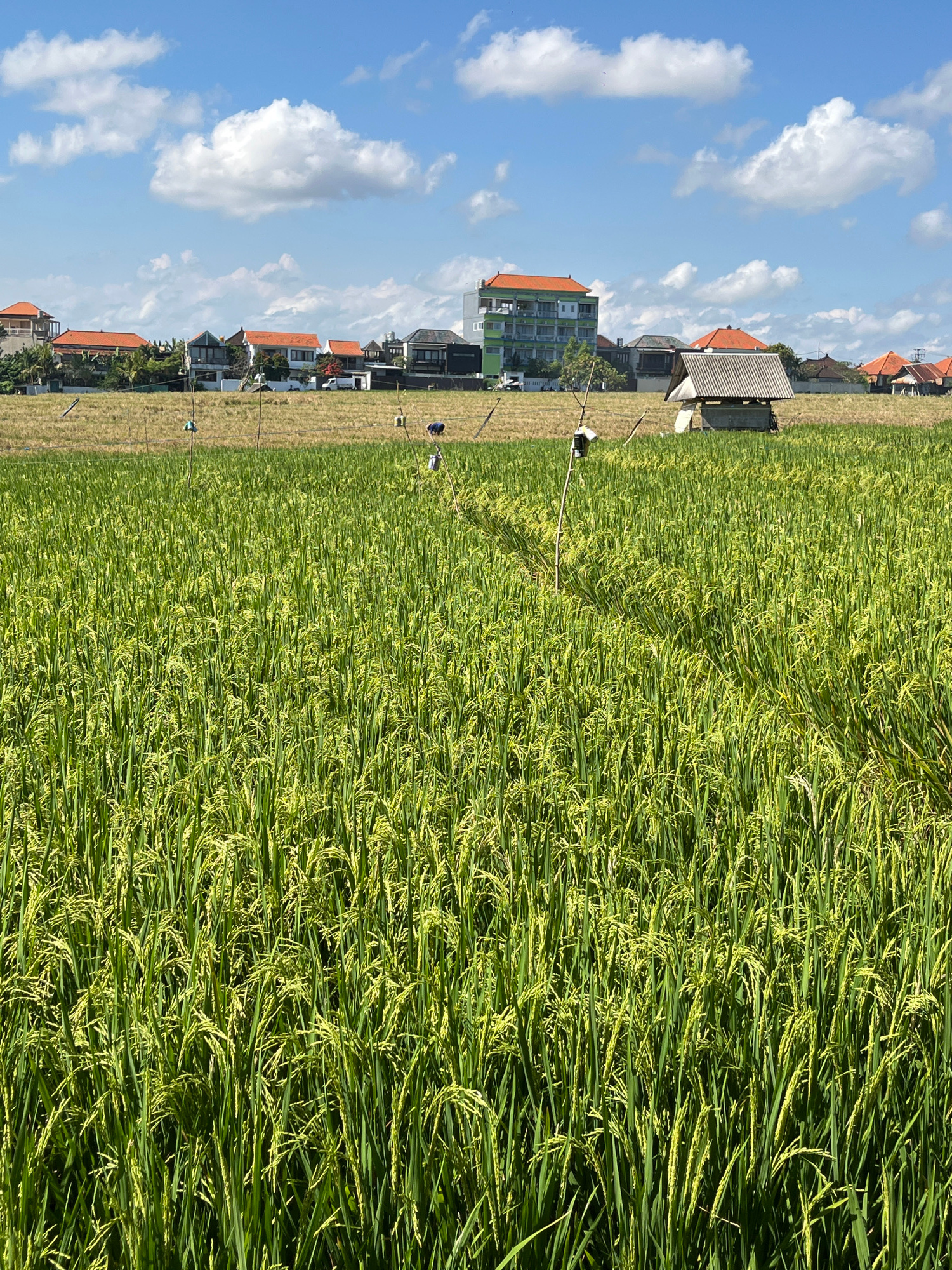 A wide-angle landscape shot captures a vibrant green rice paddy field under a bright blue sky with scattered white clouds. The image, oriented horizontally as intended, shows the extensive rice field…read more