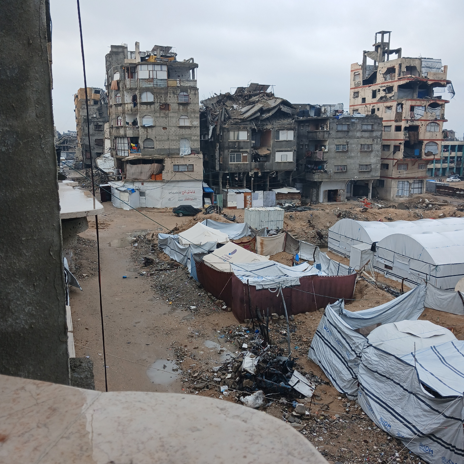 The image displays an elevated view of a severely damaged urban landscape in Gaza City, Palestinian Territory, under an overcast sky. In the foreground, a concrete ledge frames the bottom and left sid…read more