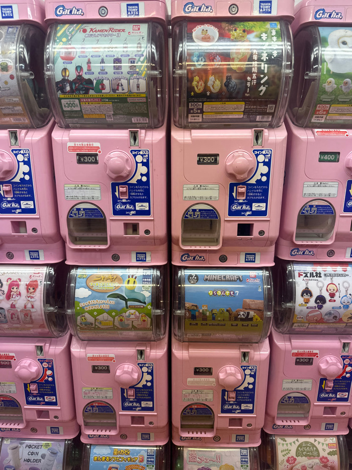 This image depicts a wall of Gachapon (capsule toy) vending machines, typically found in commercial establishments in the city of Nakano, Japan. The scene is indoors, brightly lit, and devoid of peopl…read more