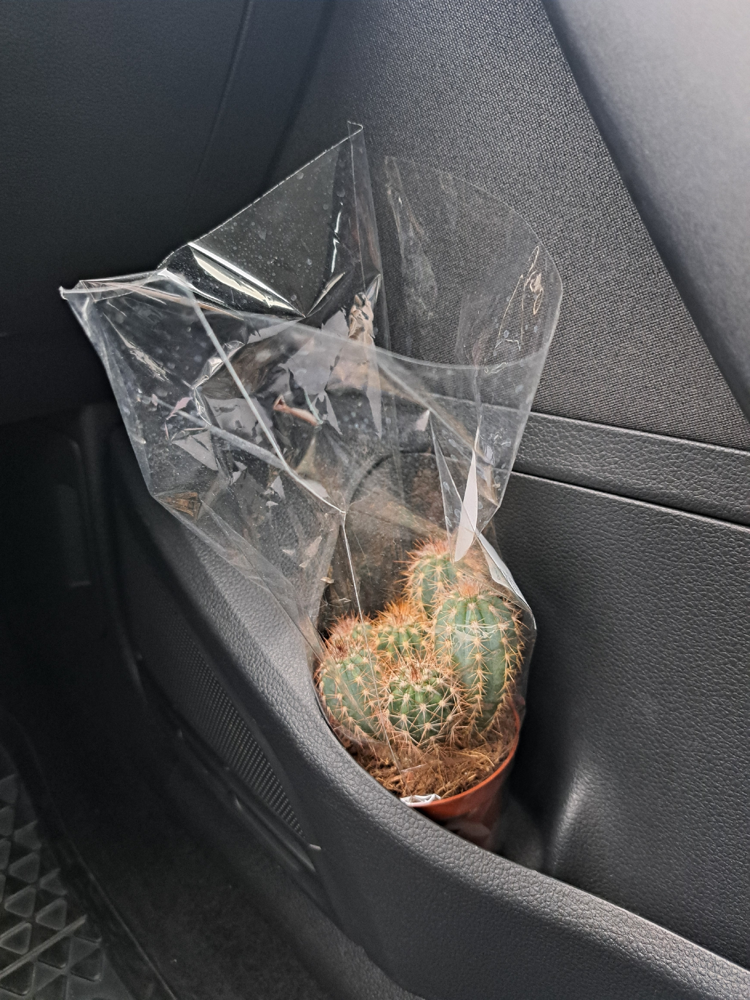 A potted cactus wrapped in clear plastic sits in a storage compartment in the interior of a vehicle. The compartment is lined with black textured material. The cactus is green with tan spines, and theβ¦read more