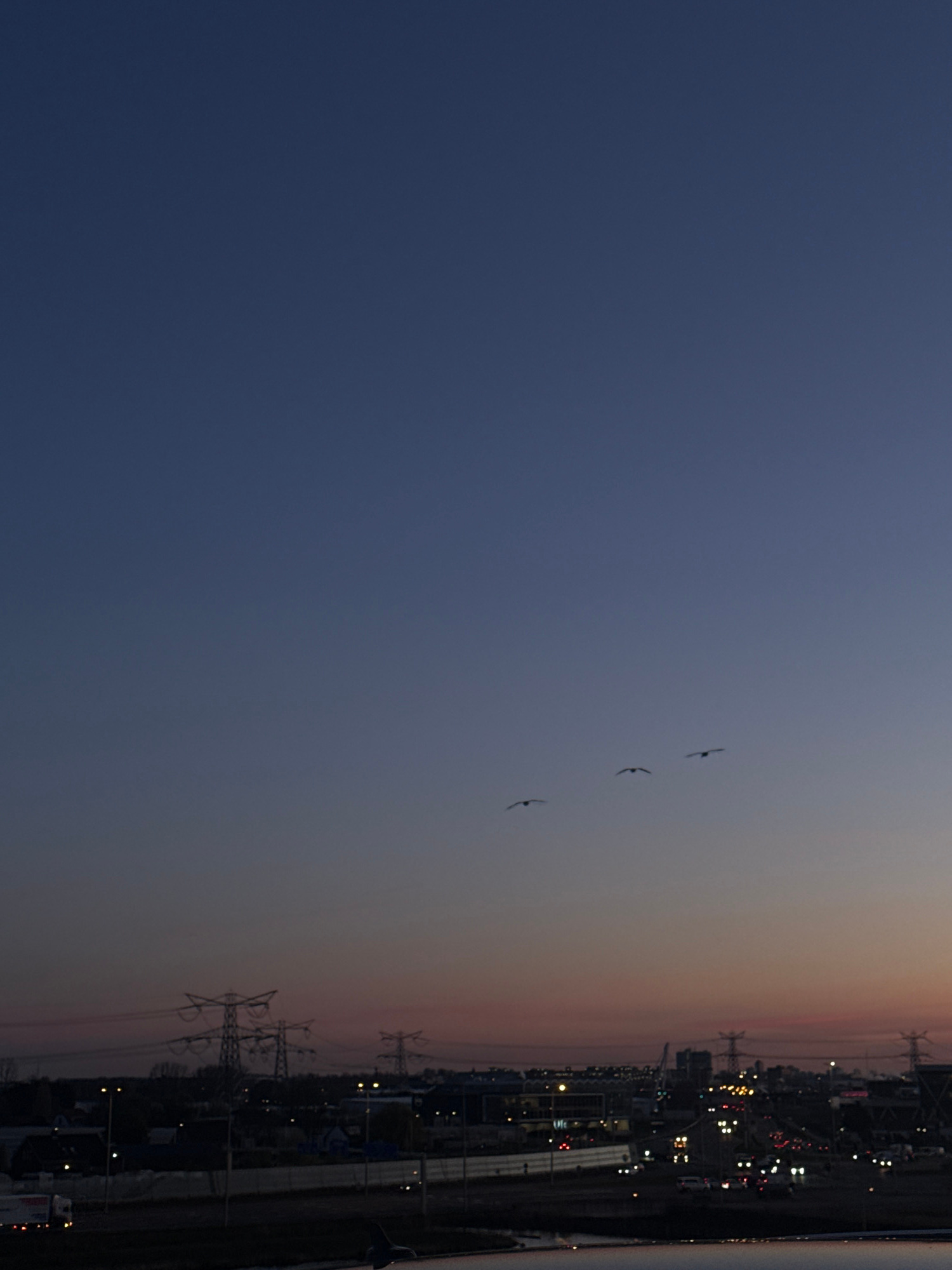 The image shows a dusk or twilight scene, likely taken from a high vantage point in Maasdijk, Netherlands. The sky transitions from a deep blue on the left to a light orange and pink towards the horizβ¦read more